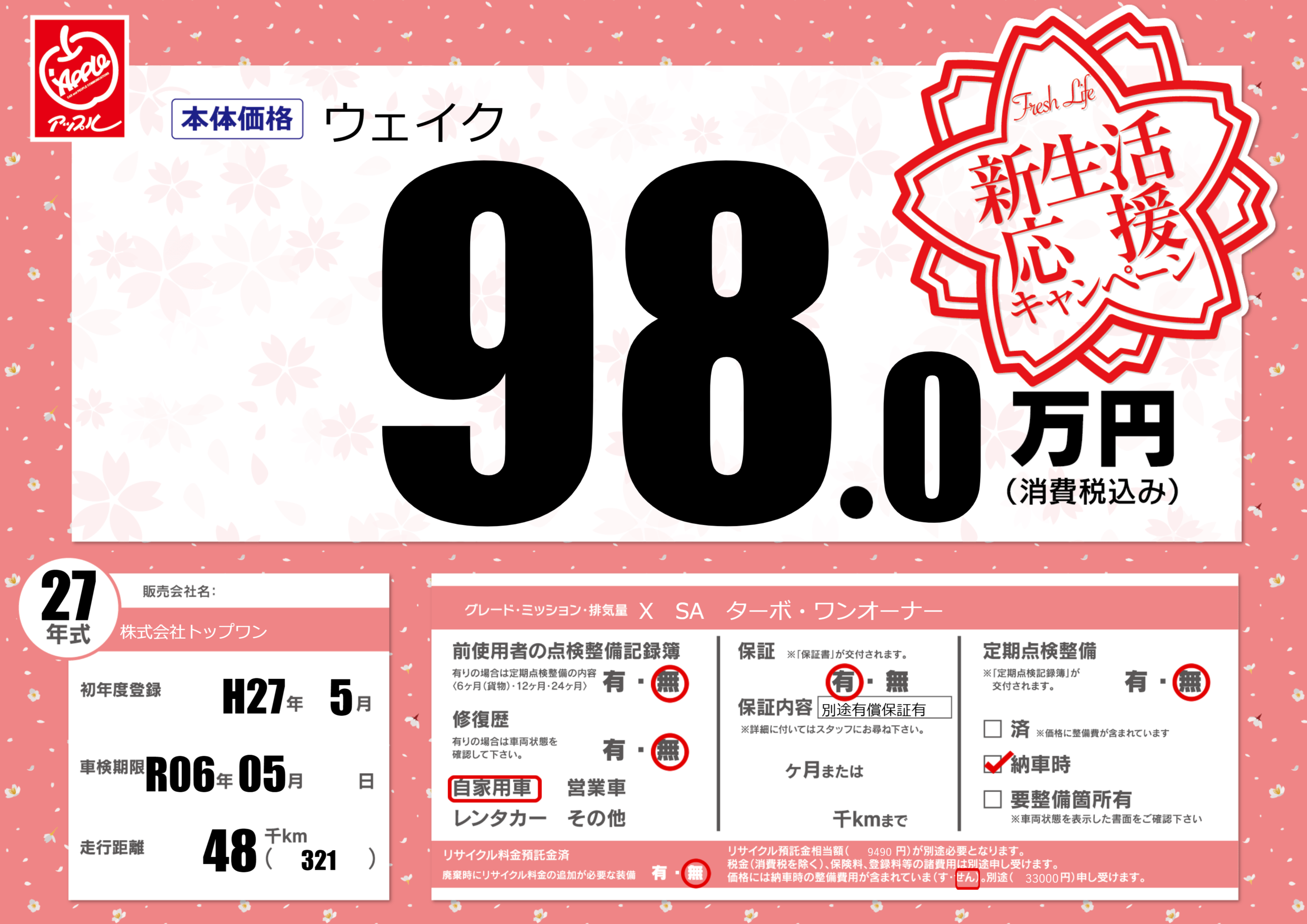 | 定期点検整備 | 定期点検整備なし 納車時あり | ||