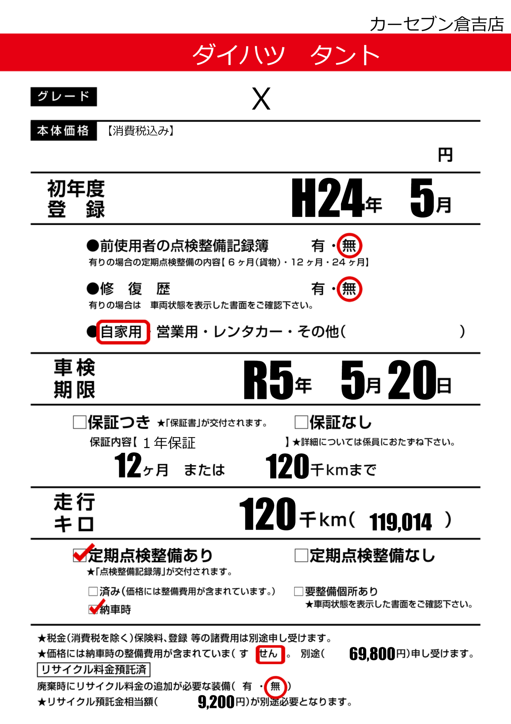 | 走行キロ | 12万km | 初年度登録 | H24年5月 |