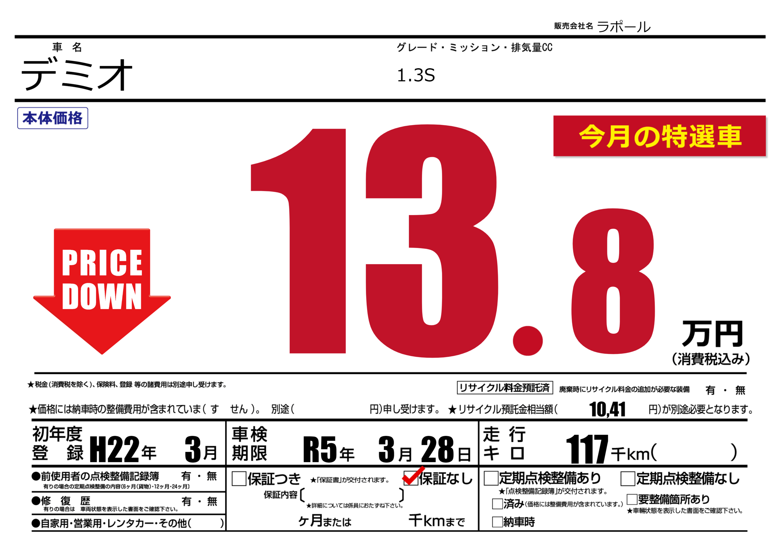 | 車名 | デミオ | グレード ミッション 排気量 |