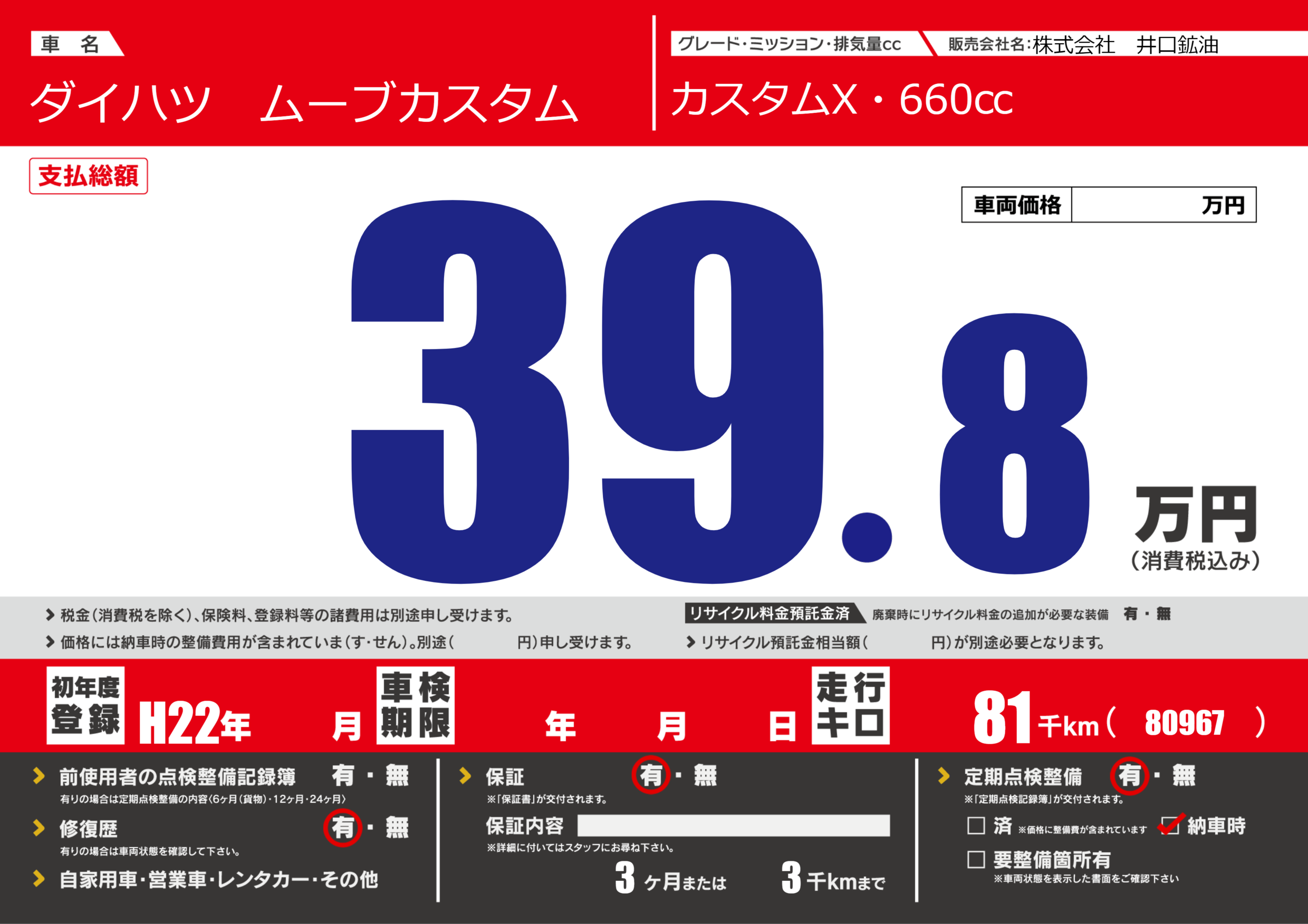 保証付き 保証内容(---) 3ヶ月または(3)千kmまで |
