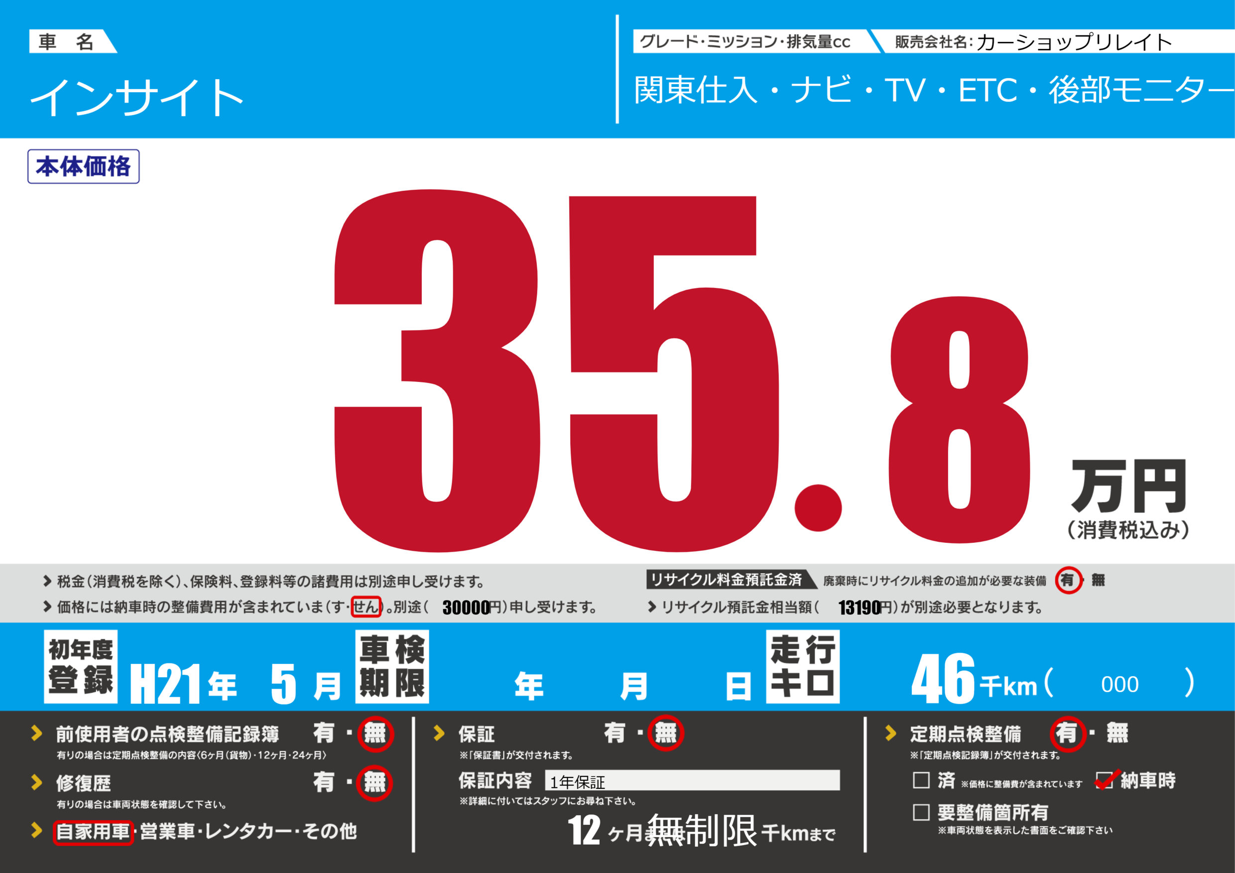 | 車名 | インサイト | グレード ミッション 排気量 |