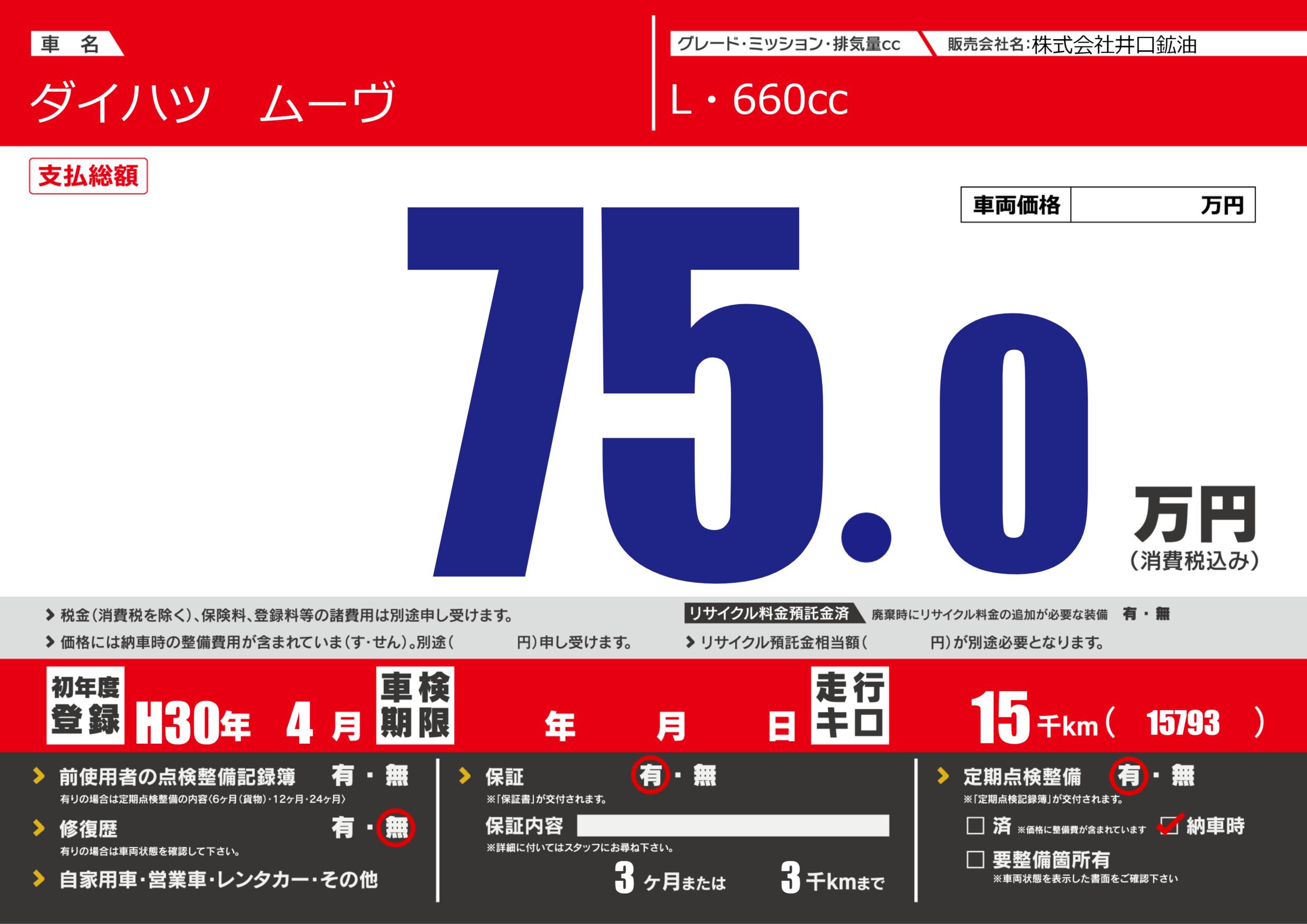 保証付き 保証内容(---) 3ヶ月または(3)千kmまで |