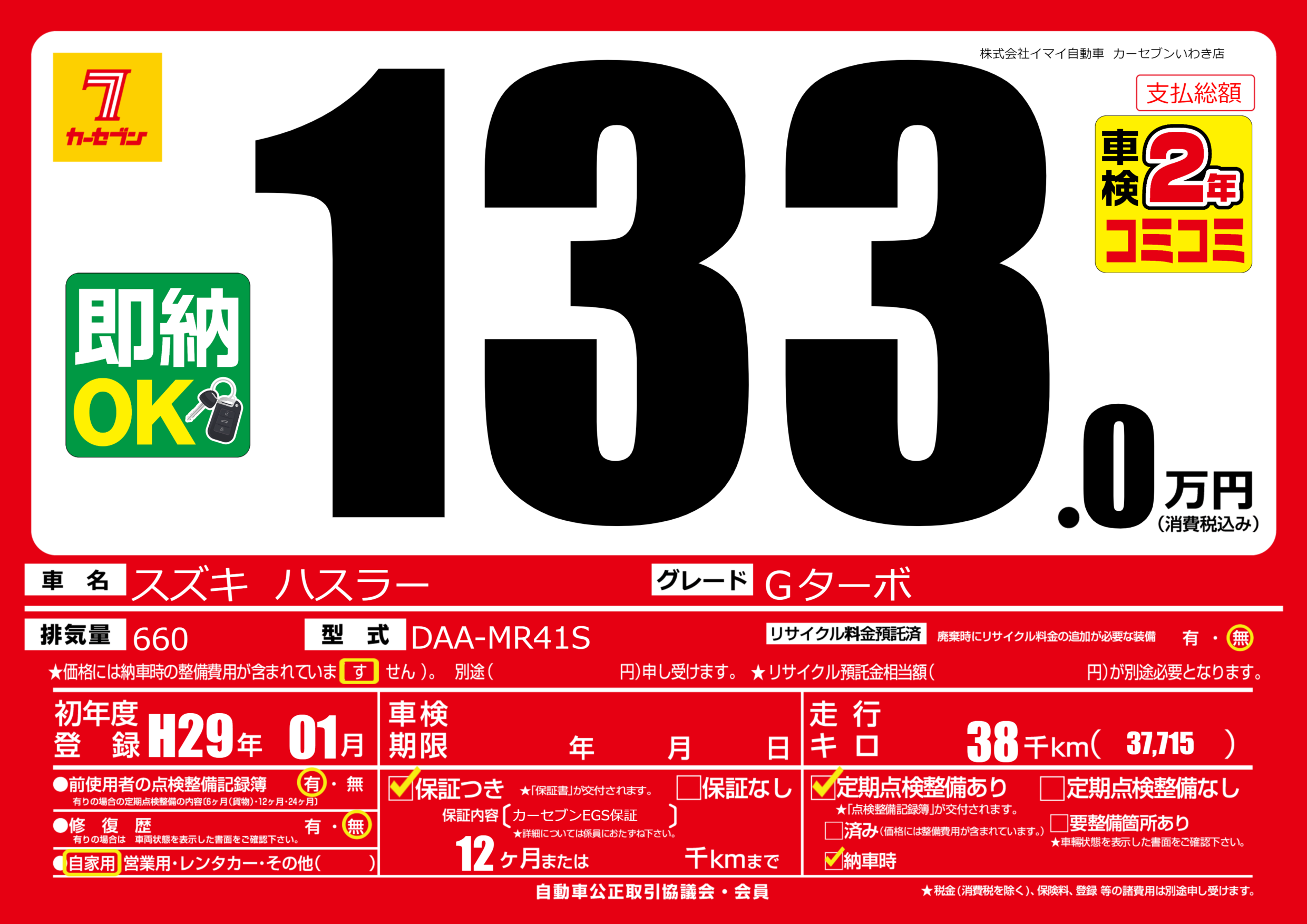 | 走行キロ | 3.8万km | 初年度登録 | H29年01月 |