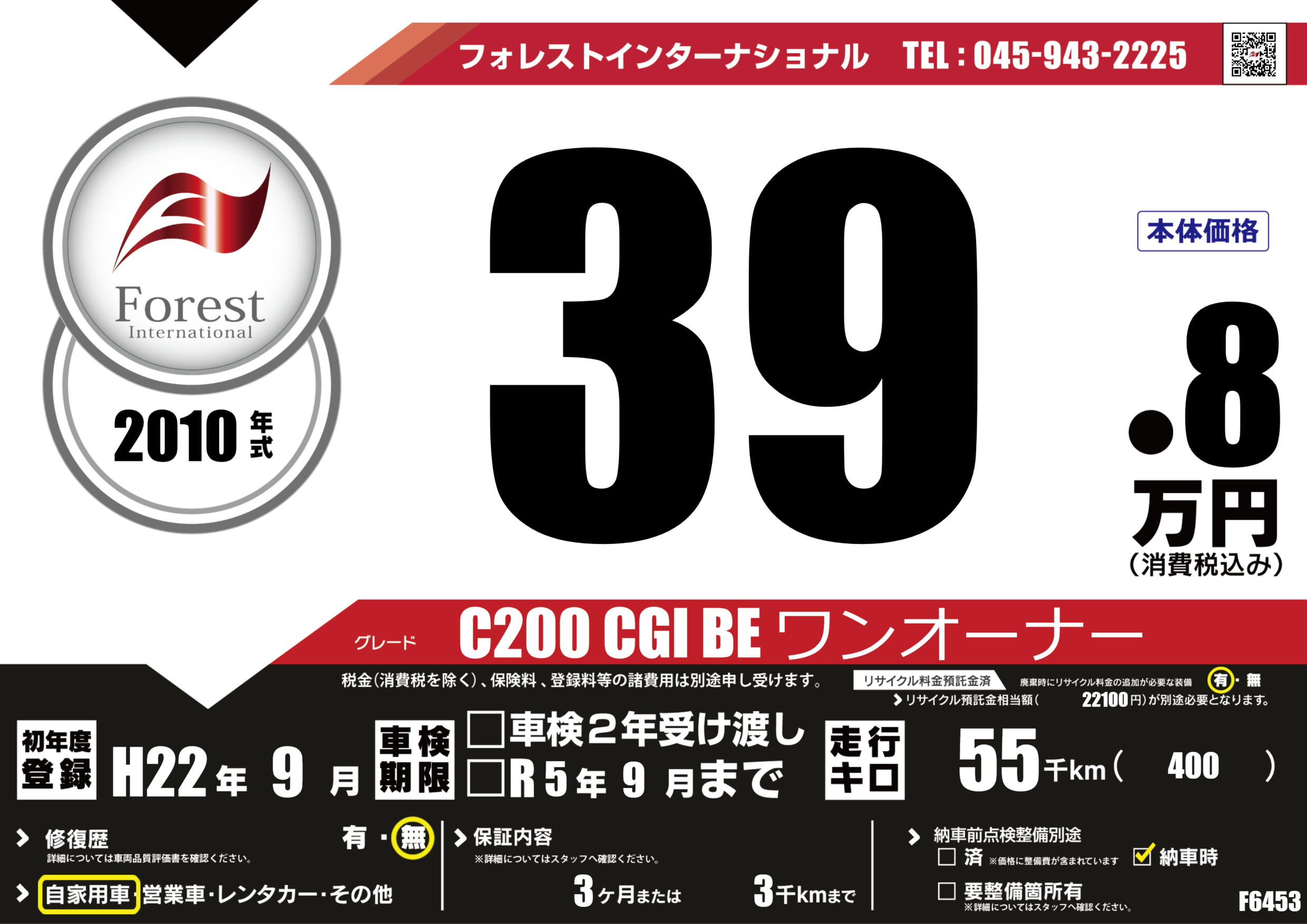 | 走行キロ | 5.5万km | 初年度登録 | H22年9月 |