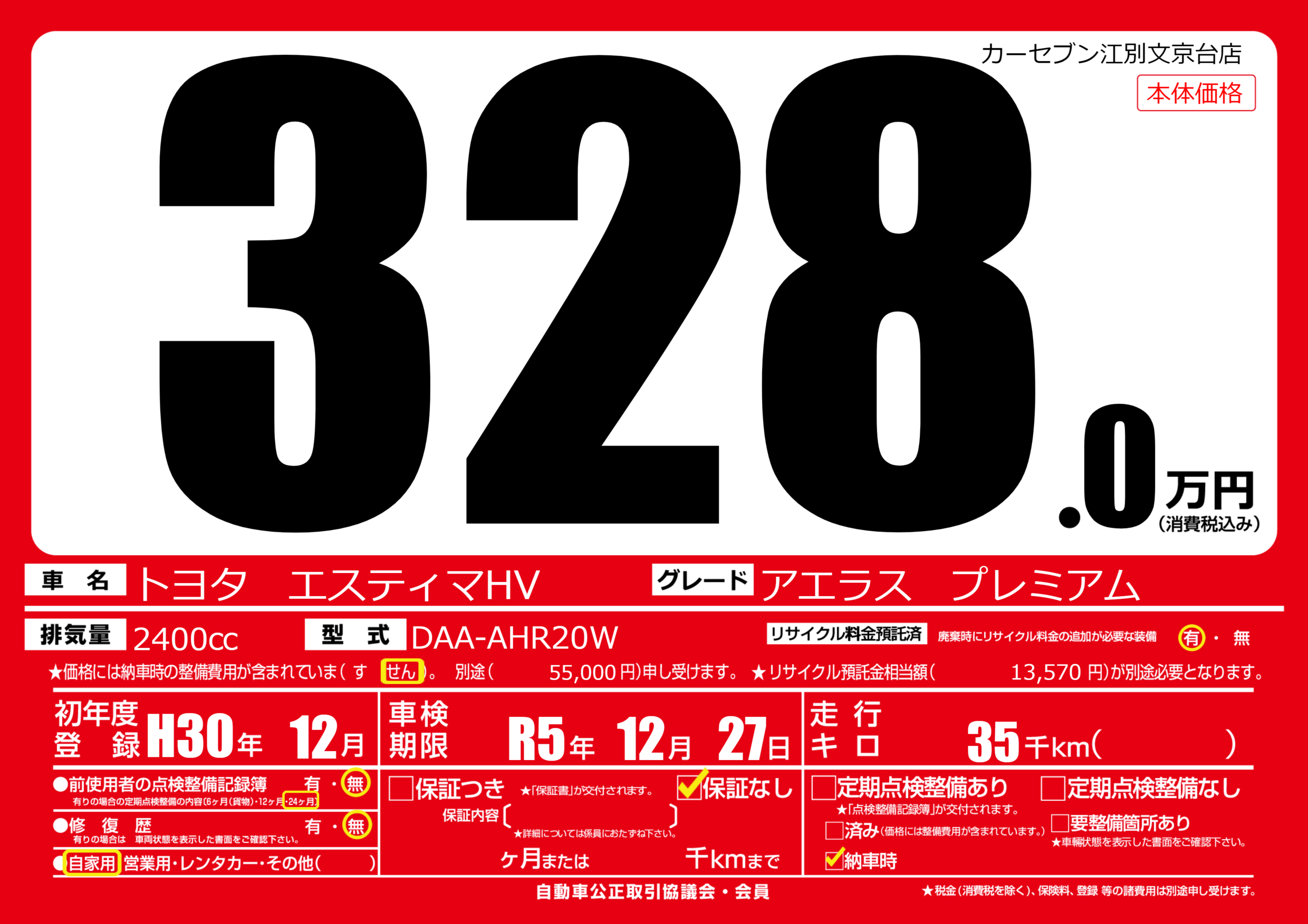 | 車名 | トヨタ エスティマHV | グレード ミッション 排気量 |