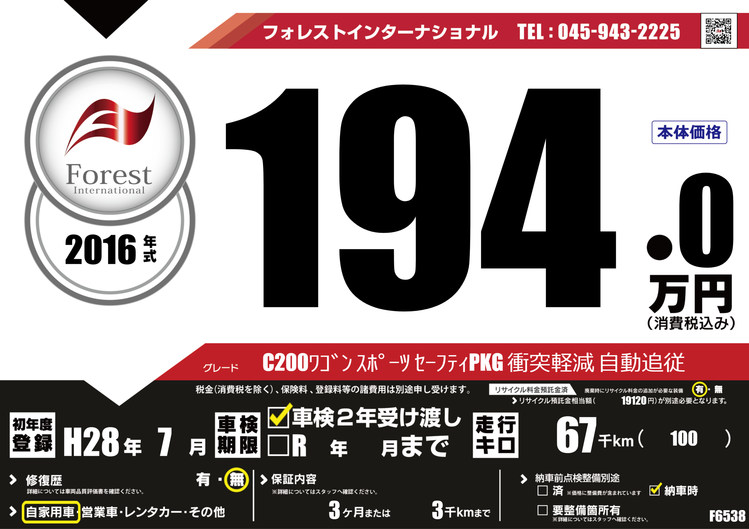 | 走行キロ | 6.7万km | 初年度登録 | H28年7月 |
