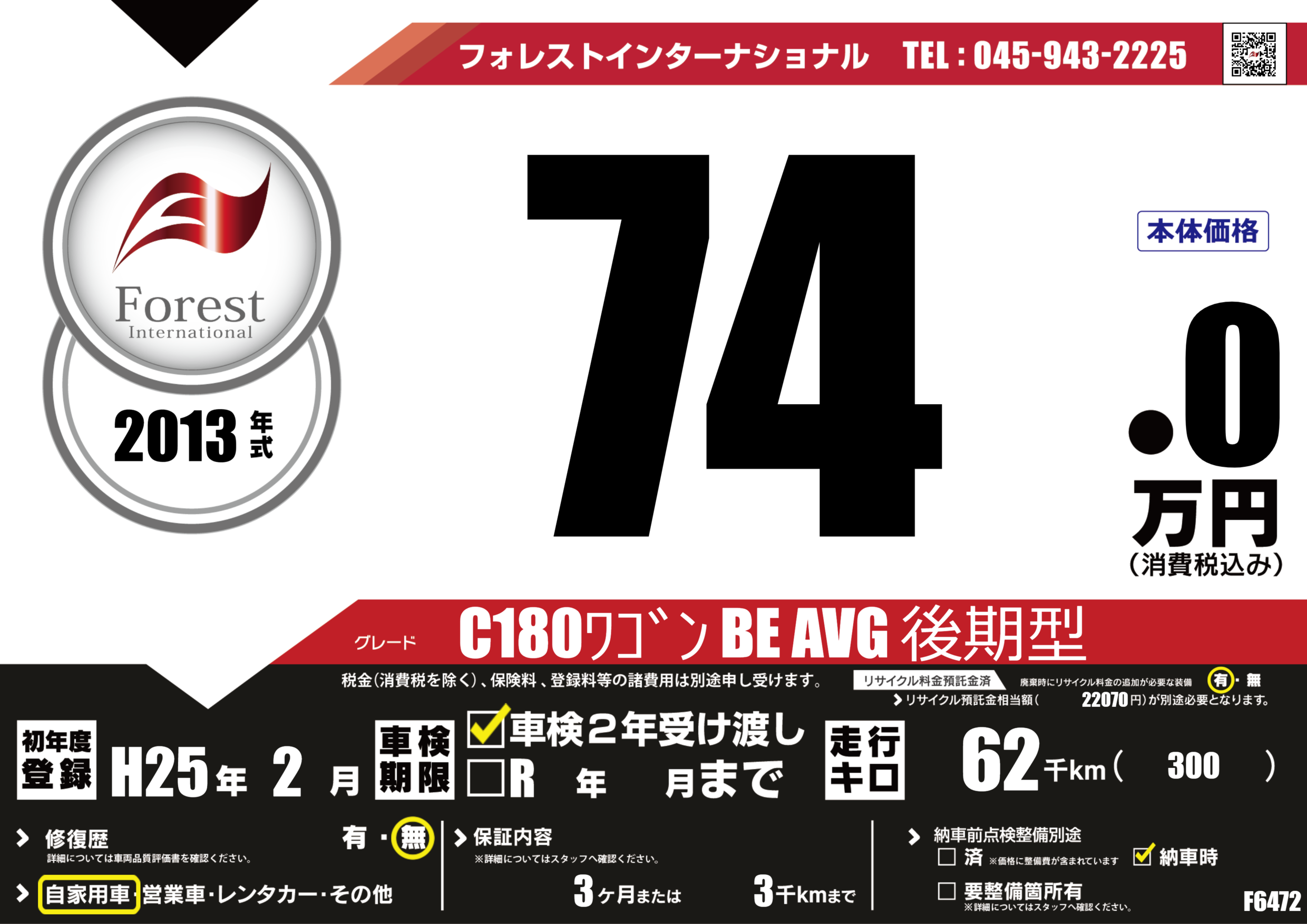 | 走行キロ | 6.2万km | 初年度登録 | H25年2月 |