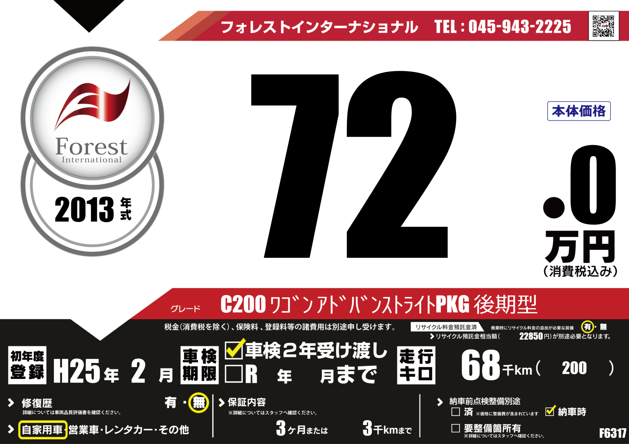 | 走行キロ | 6.8万km | 初年度登録 | H25年2月 |