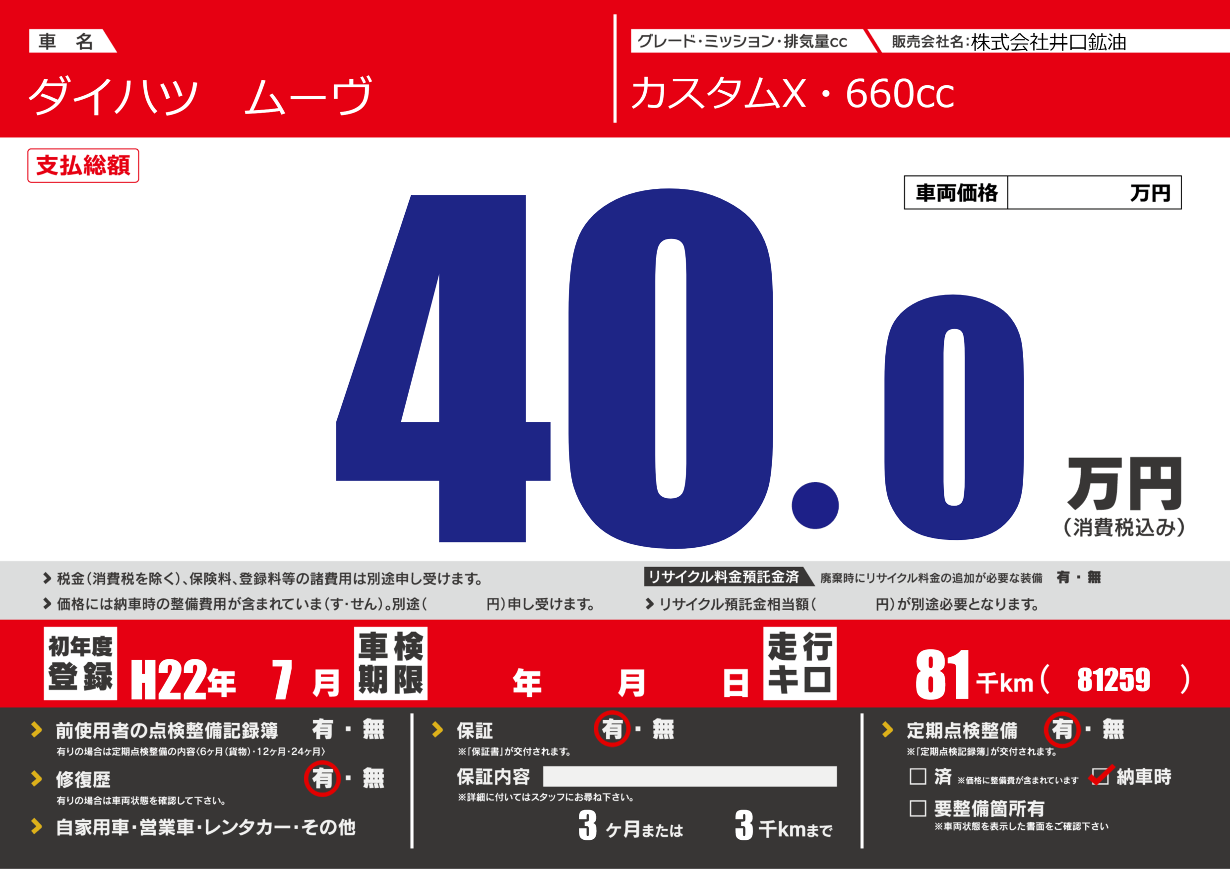 | 定期点検整備 | 定期点検整備あり 納車時あり | ||