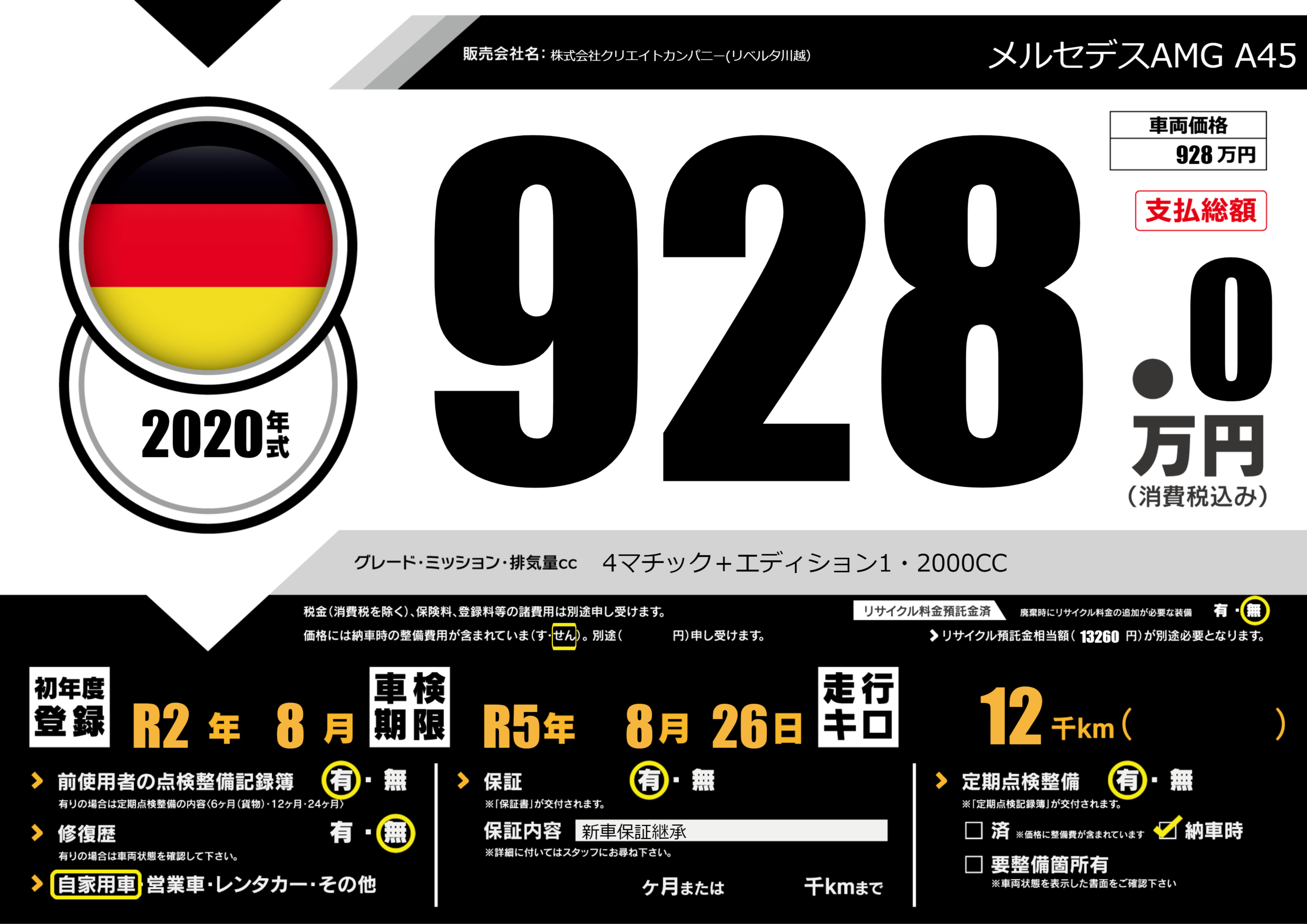 | 車名 | メルセデスAMG A45 | グレード ミッション 排気量 |