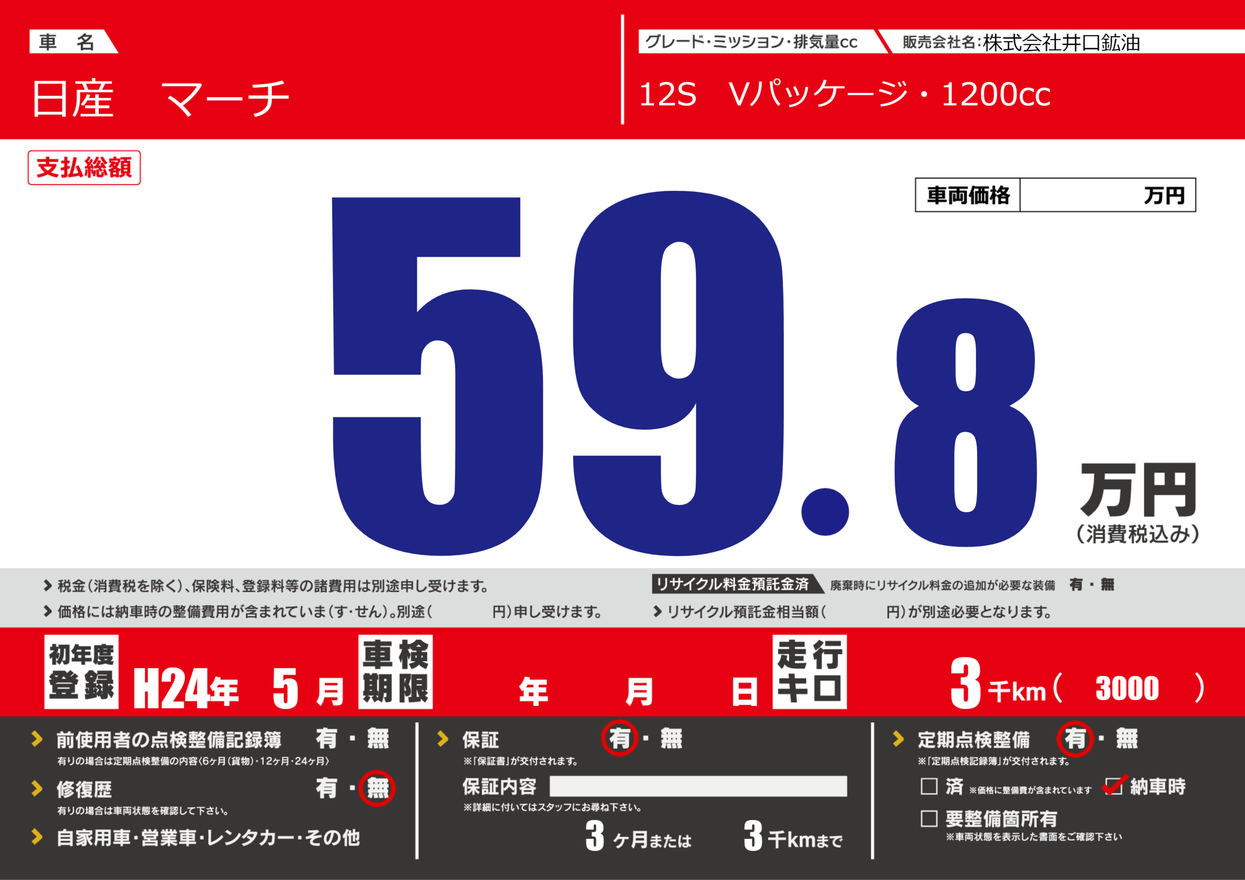 保証付き 保証内容(---) 3ヶ月または(3)千kmまで |