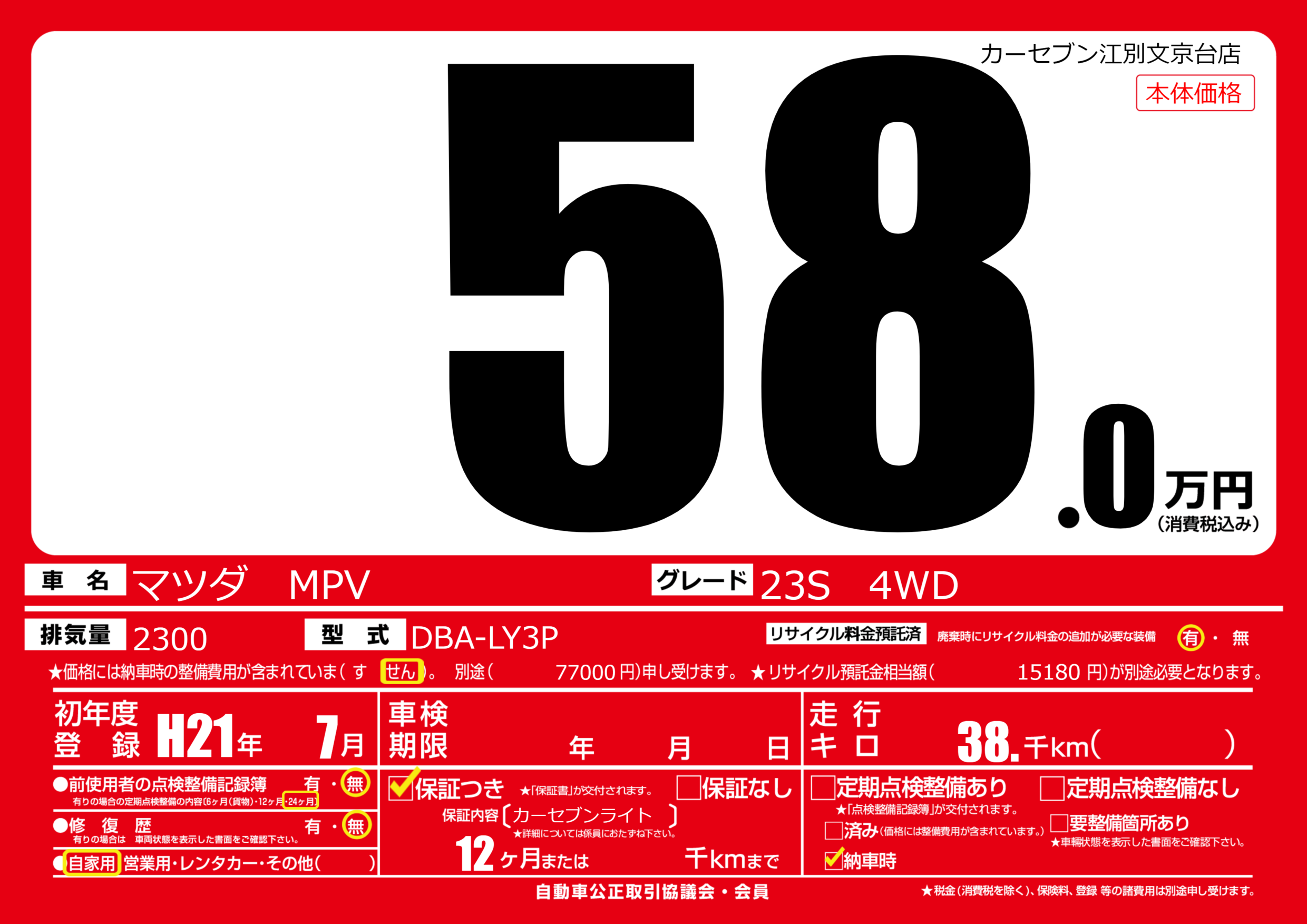 | 車名 | マツダ MPV | グレード ミッション 排気量 |