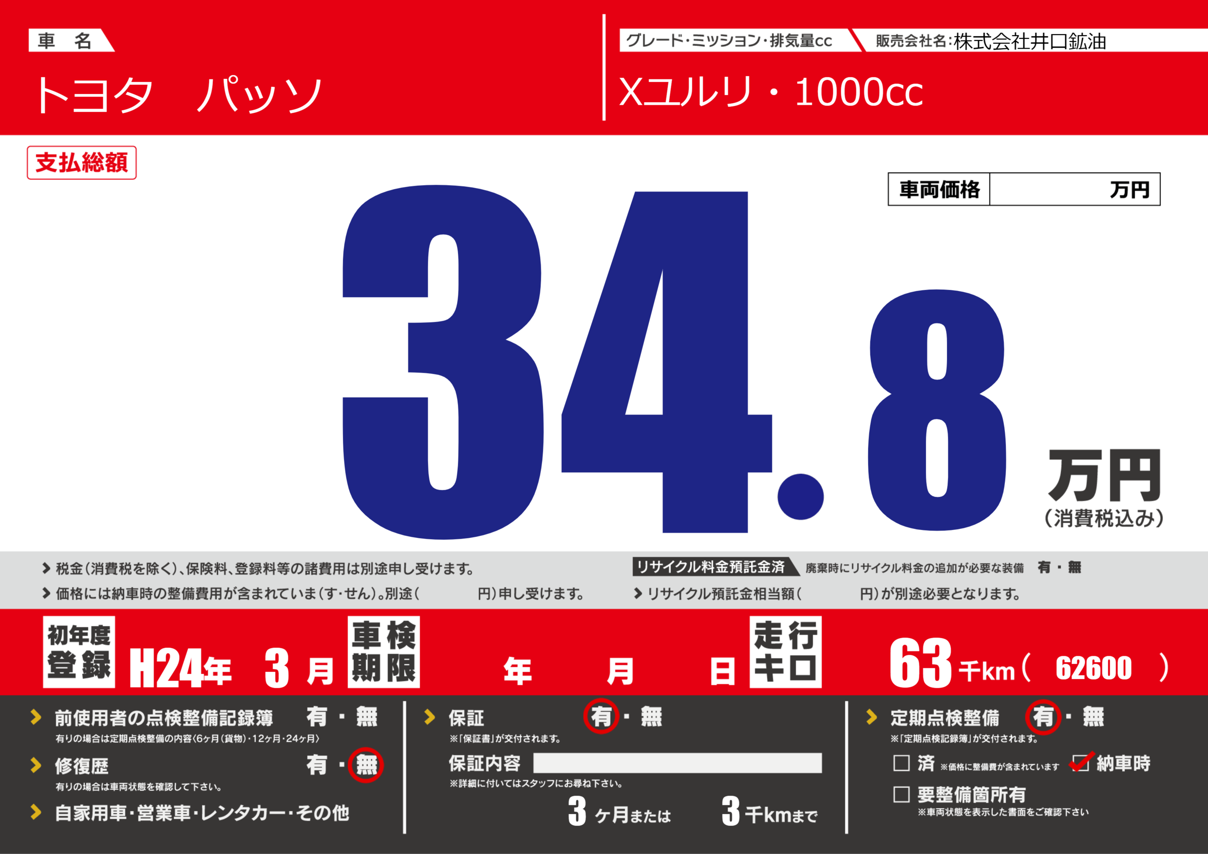 | 車名 | トヨタ パッソ | グレード ミッション 排気量 |