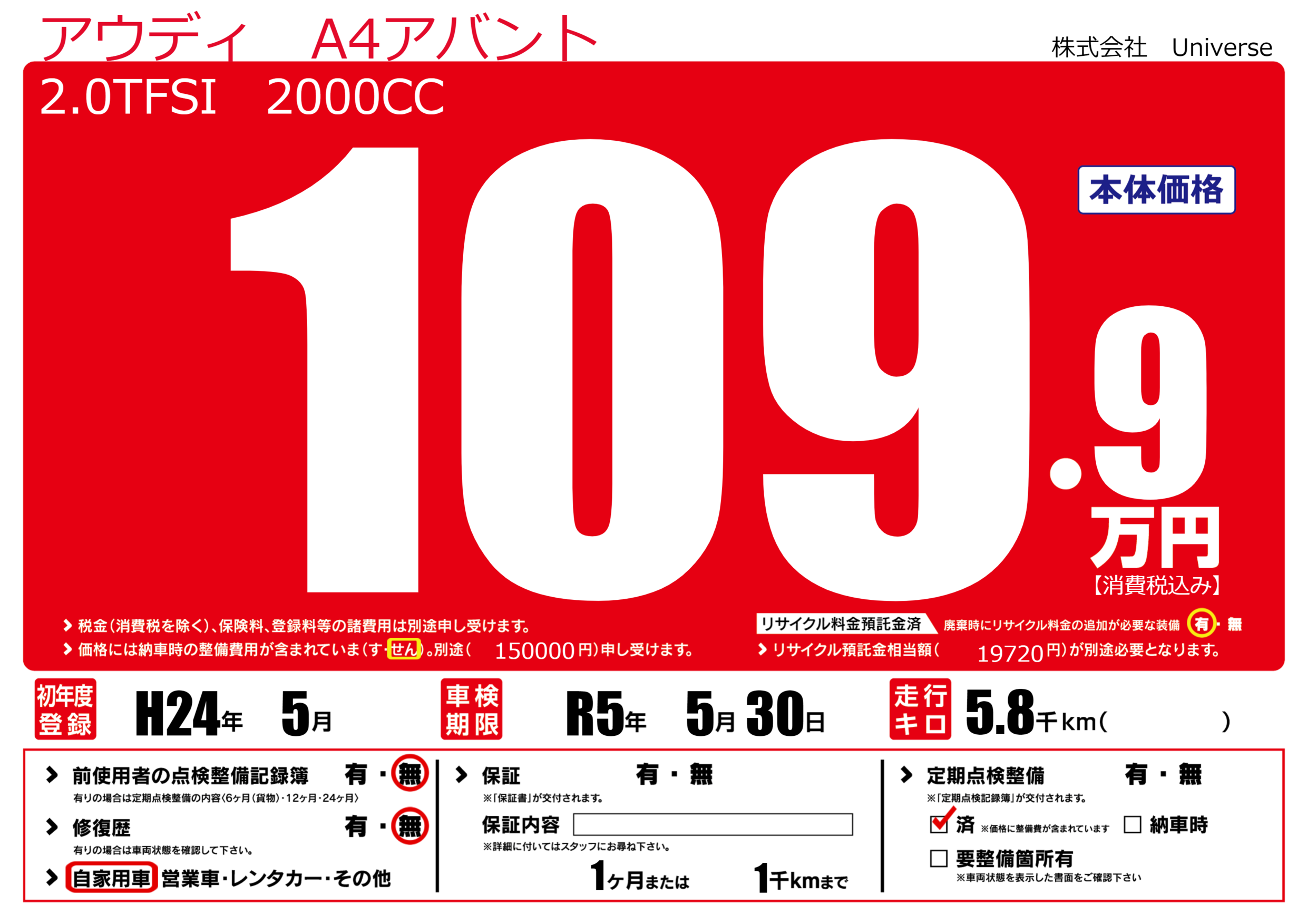 | 車名 | アウディ A4アバント | グレード ミッション 排気量 |
