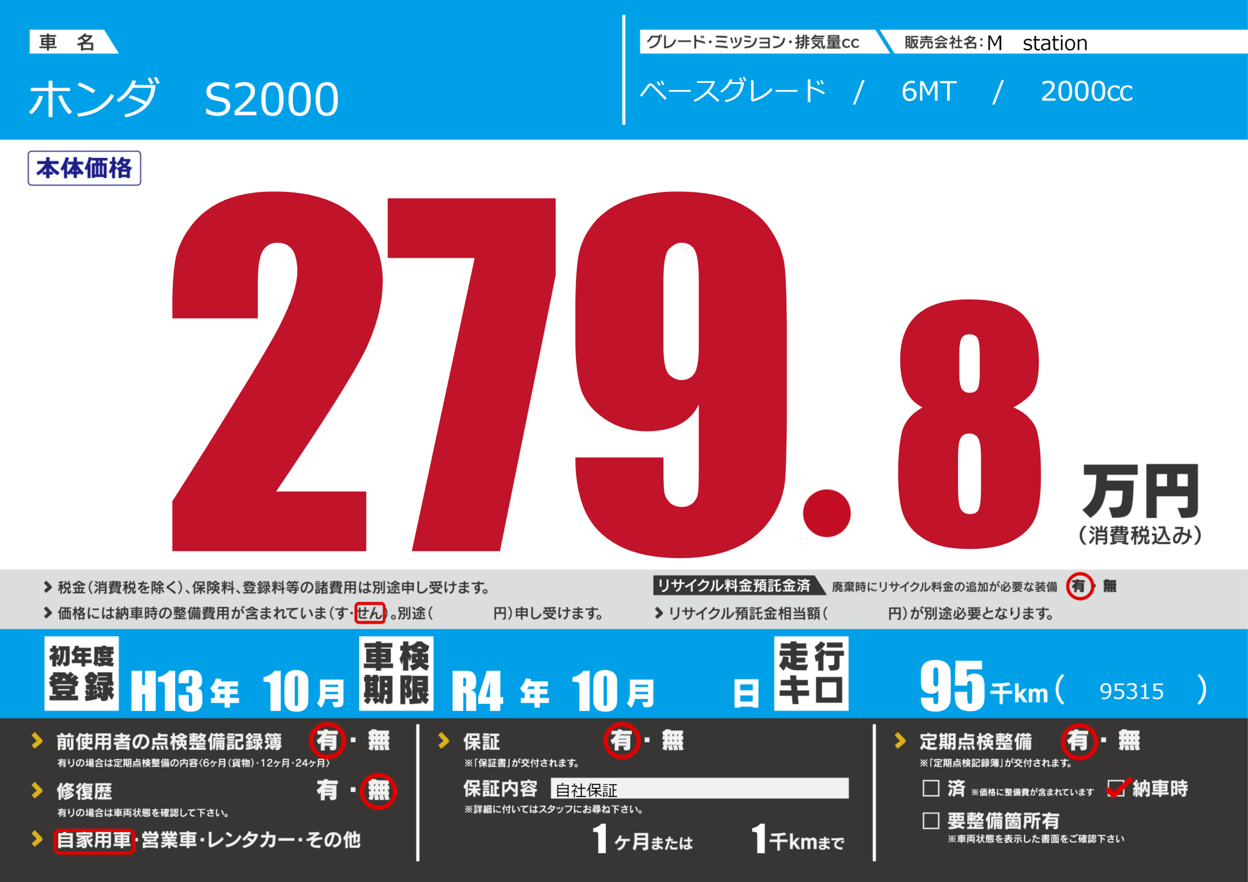 | 定期点検整備 | 定期点検整備あり 納車時あり | ||