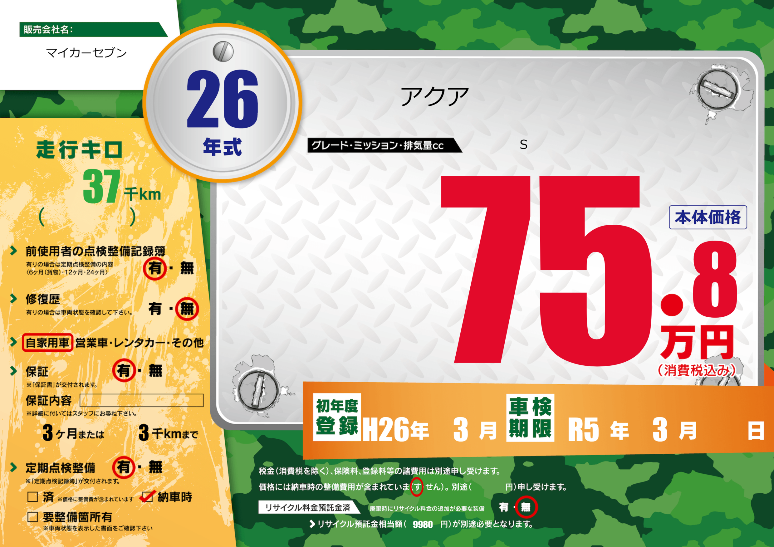 | 走行キロ | 3.7万km | 初年度登録 | H26年3月 |