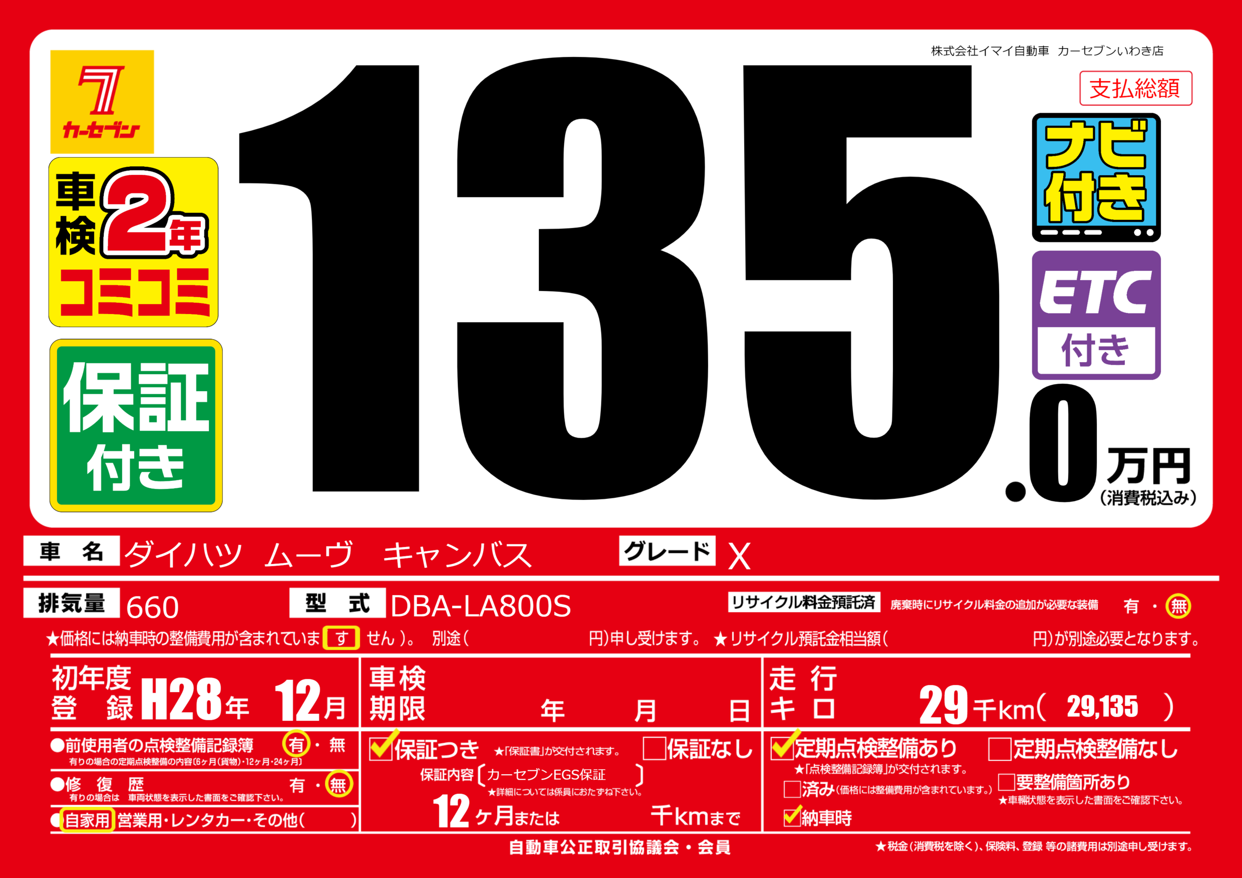 | 走行キロ | 2.9万km | 初年度登録 | H28年12月 |