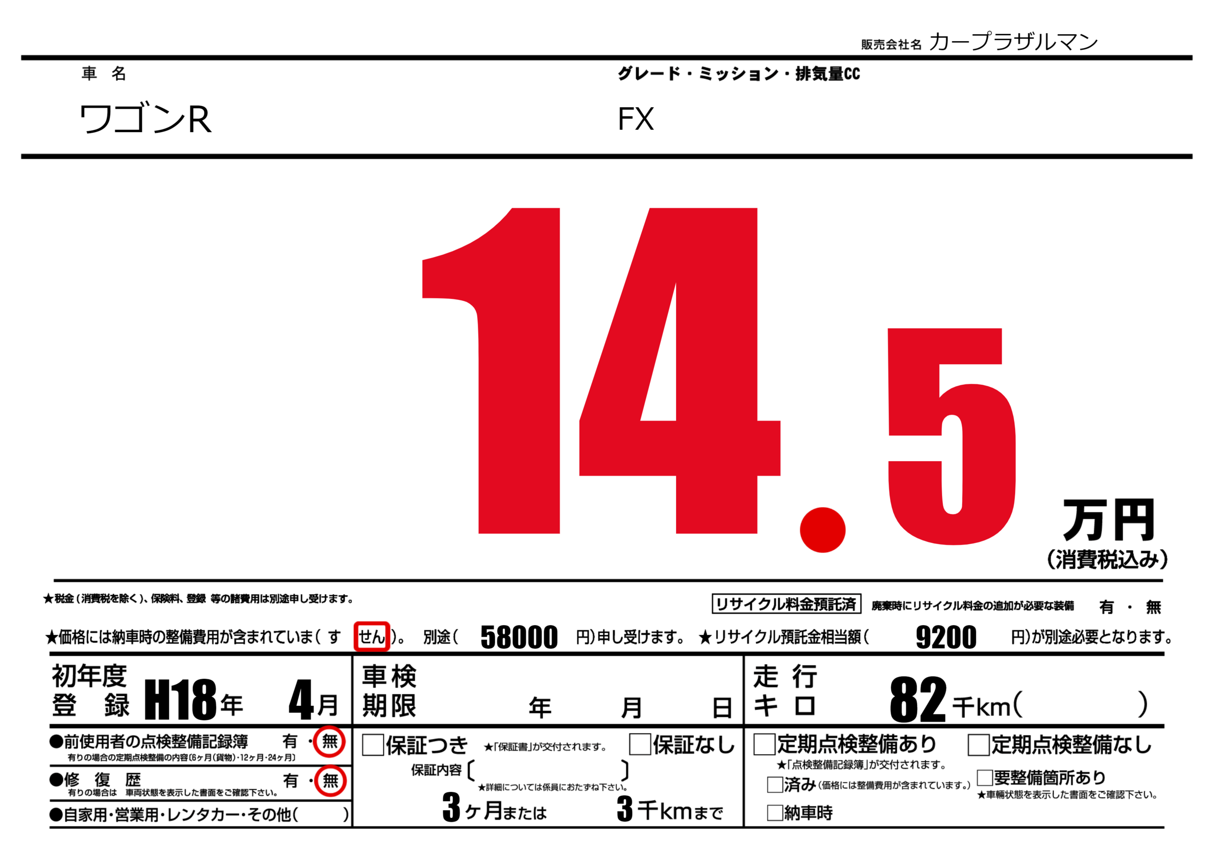 | 車名 | ワゴンR | グレード ミッション 排気量 |