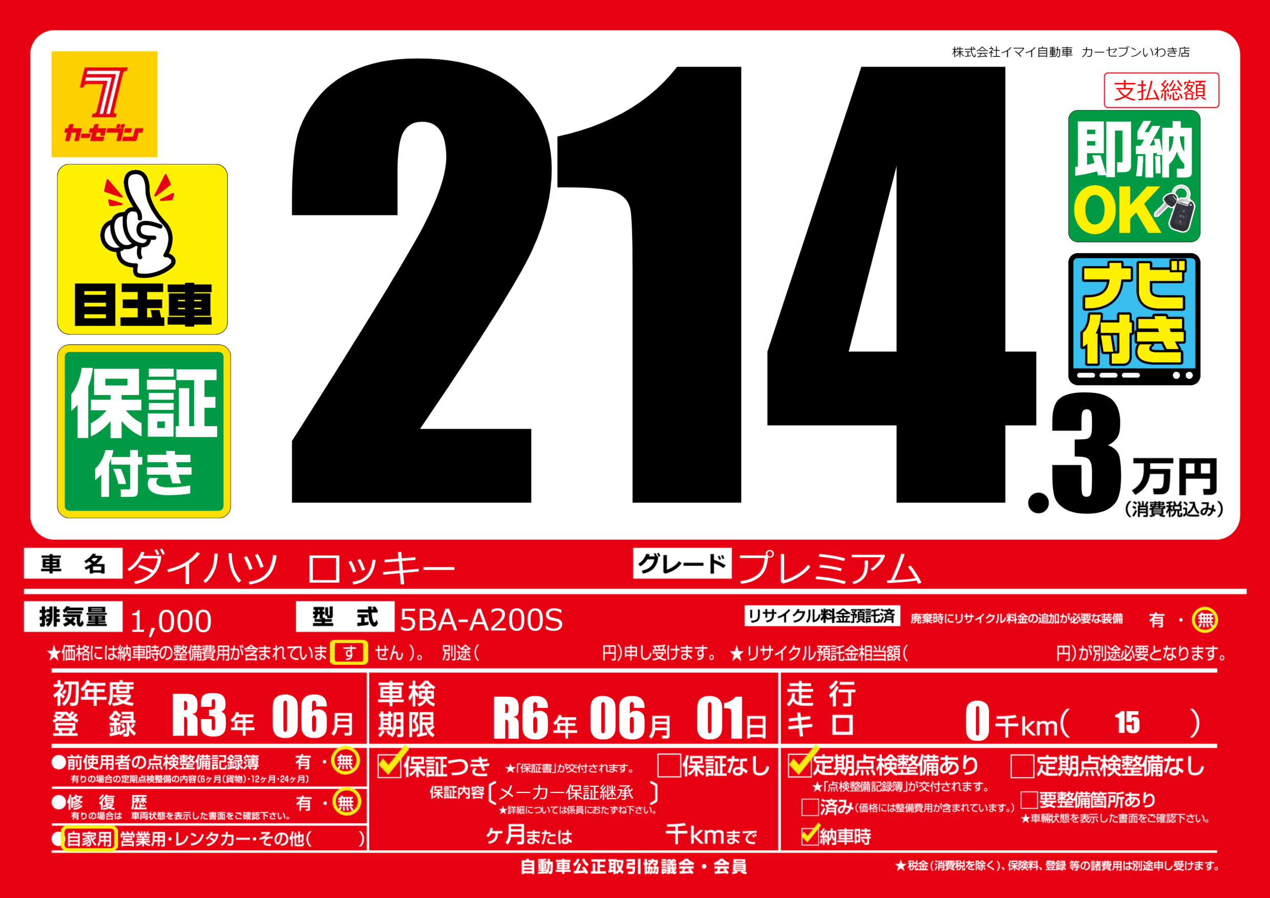 | 車名 | ダイハツ ロッキー | グレード ミッション 排気量 |