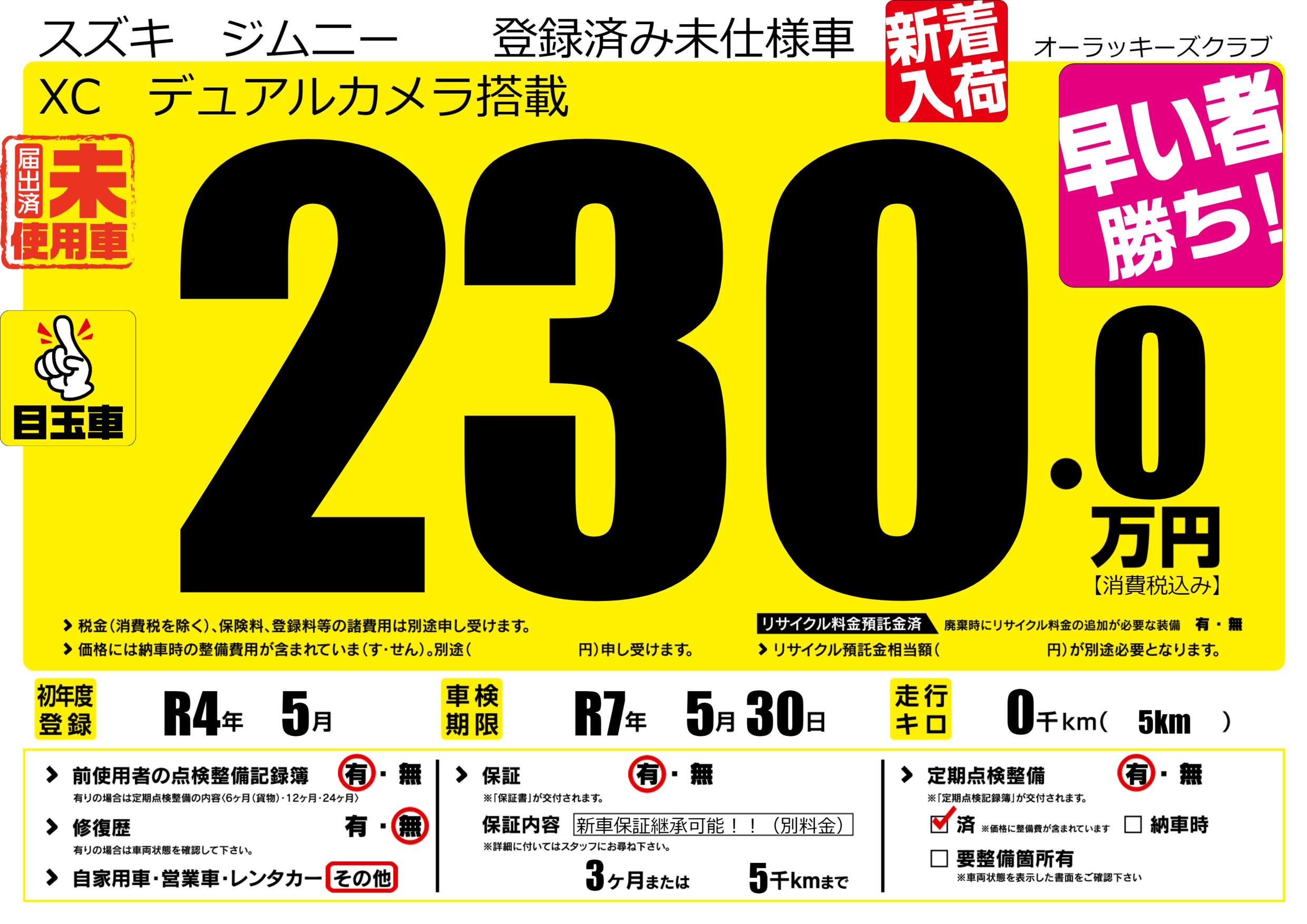| 車名 | スズキ ジムニー 登録済み未仕様車 | グレード ミッション 排気量 |