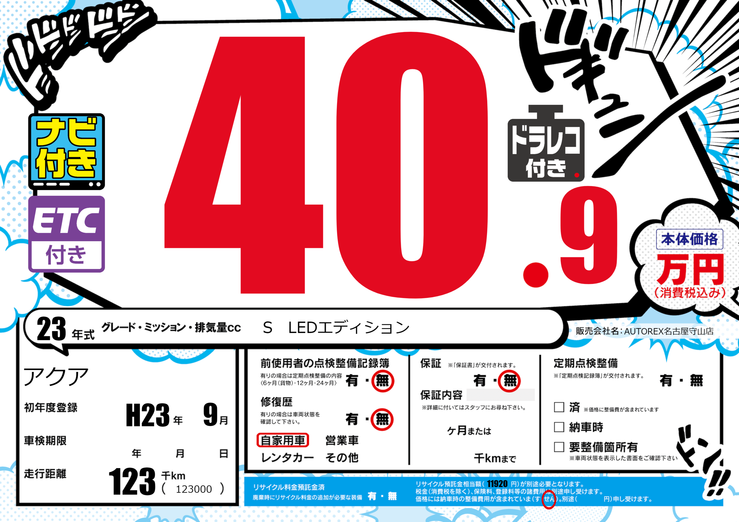 | 走行キロ | 12.3万km | 初年度登録 | H23年9月 |