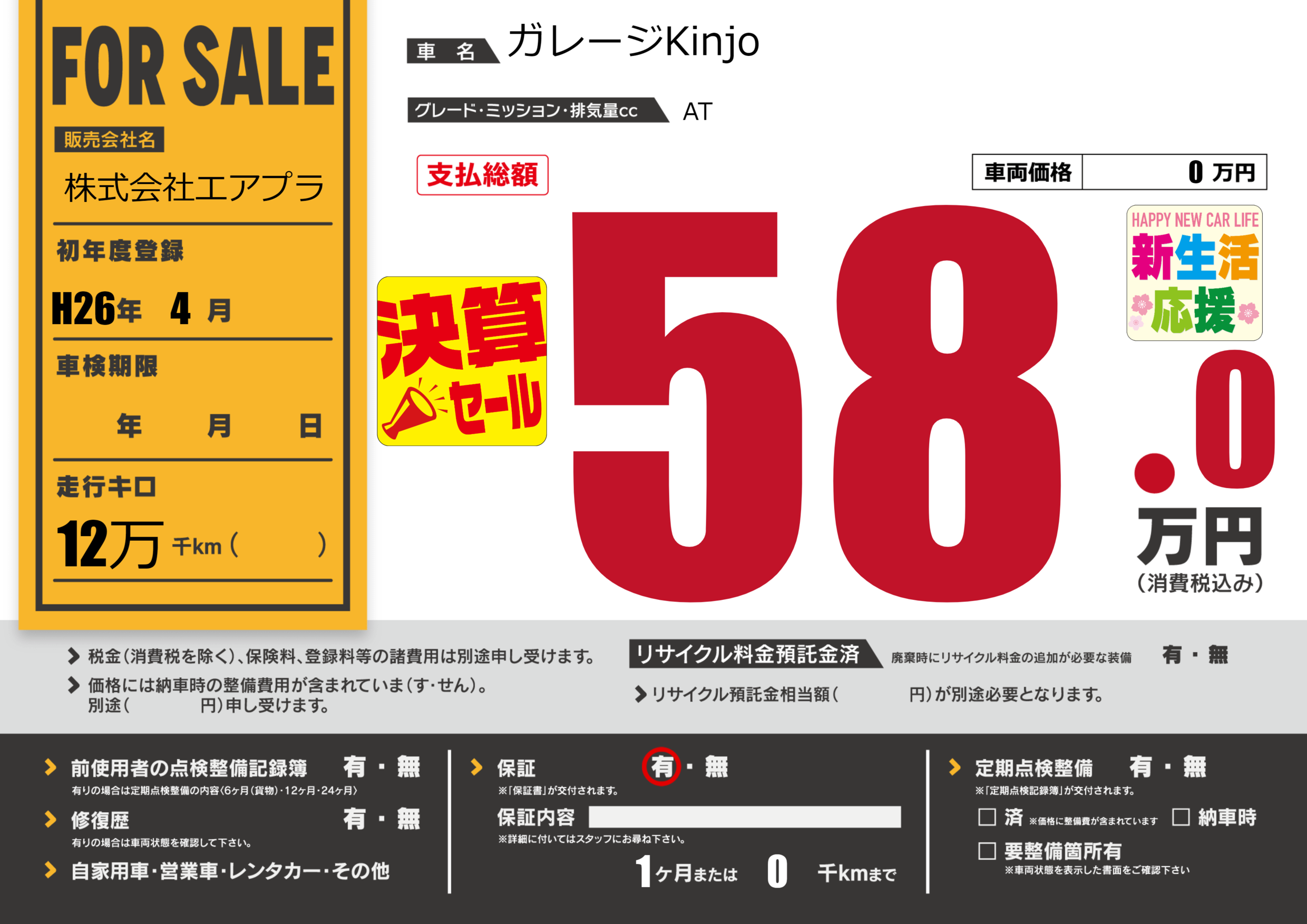 保証付き 保証内容(---) 1ヶ月または(0)千kmまで |