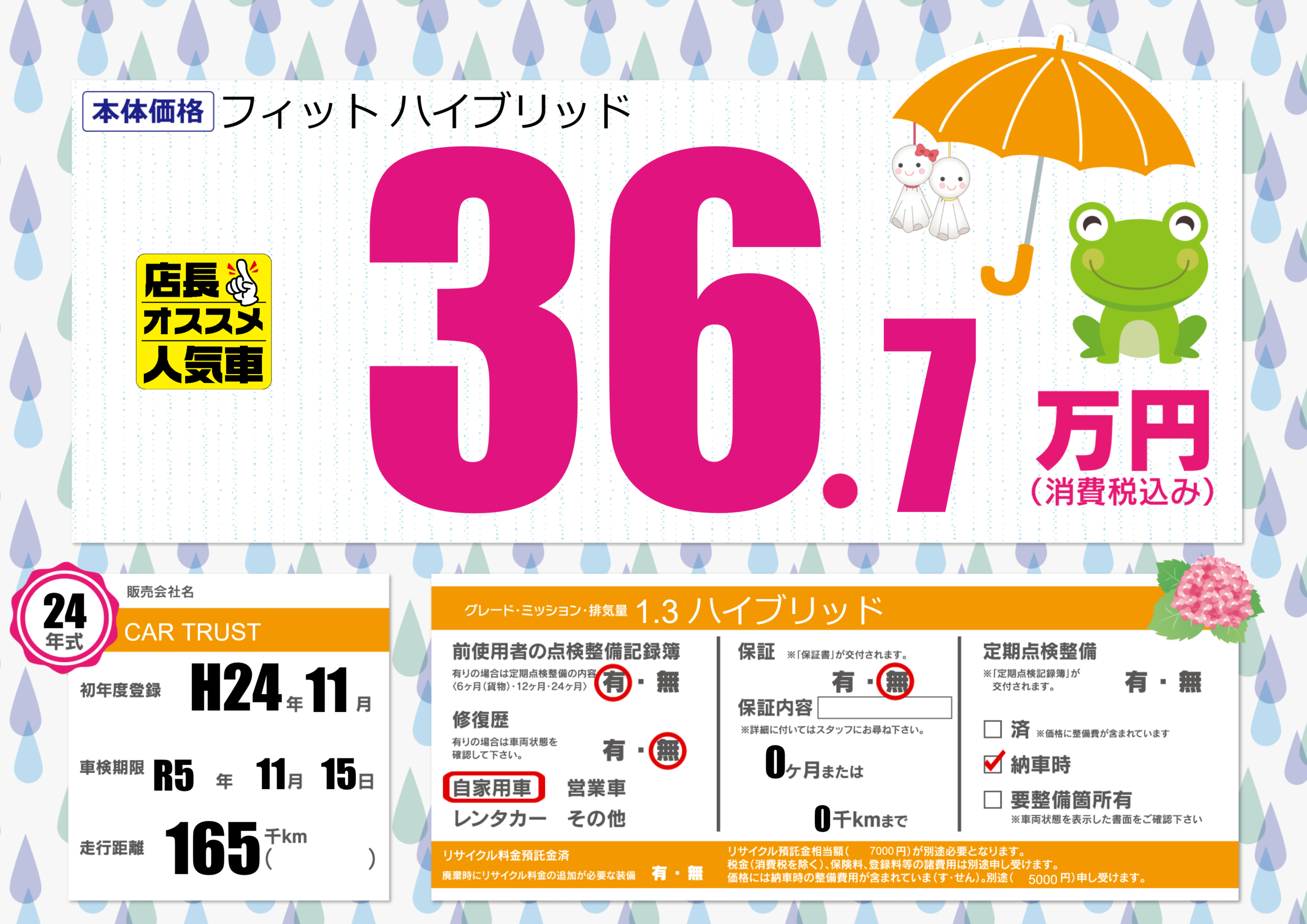 | 車名 | フィット ハイブリッド | グレード ミッション 排気量 |