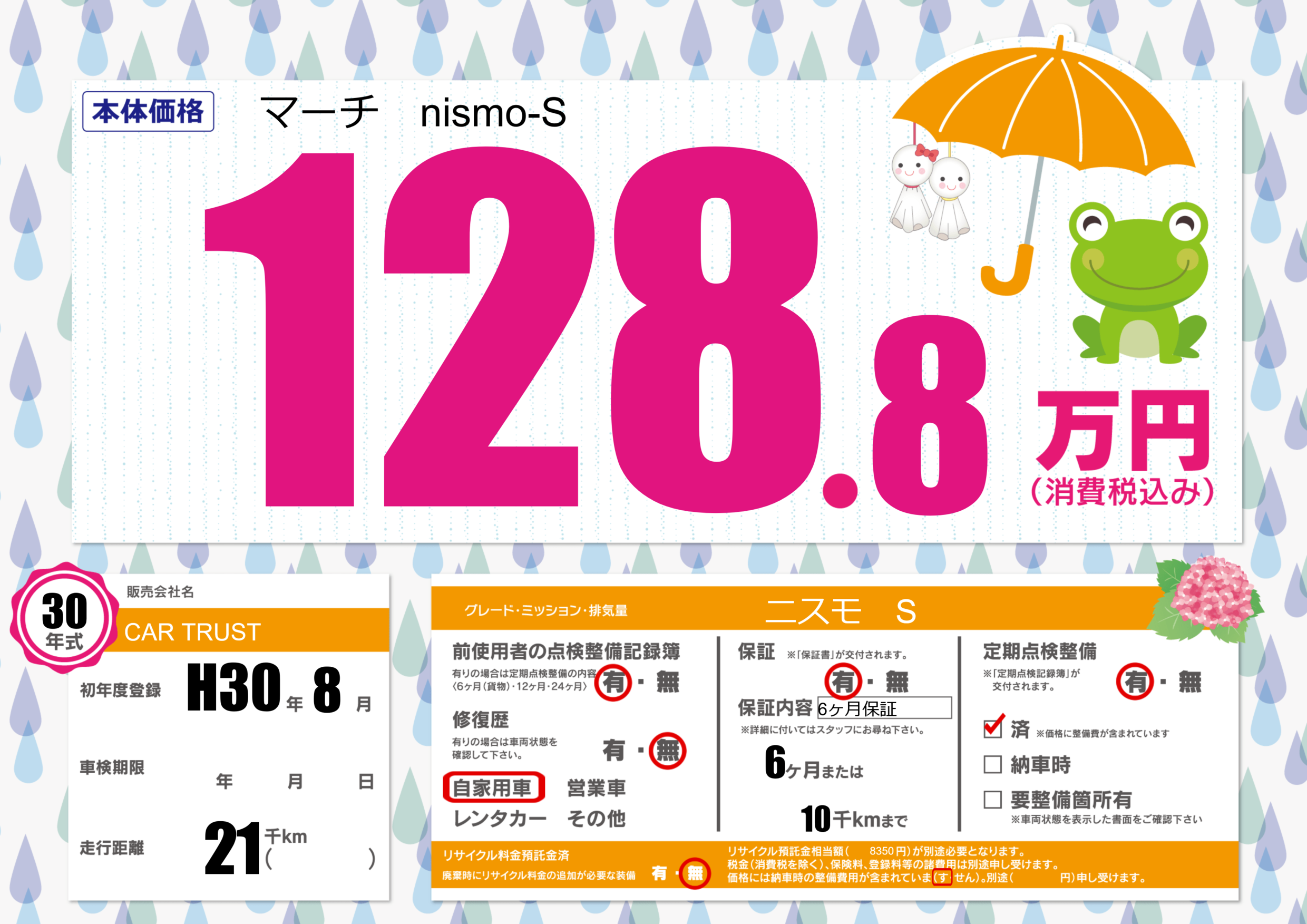 | 車名 | マーチ nismo-S | グレード ミッション 排気量 |