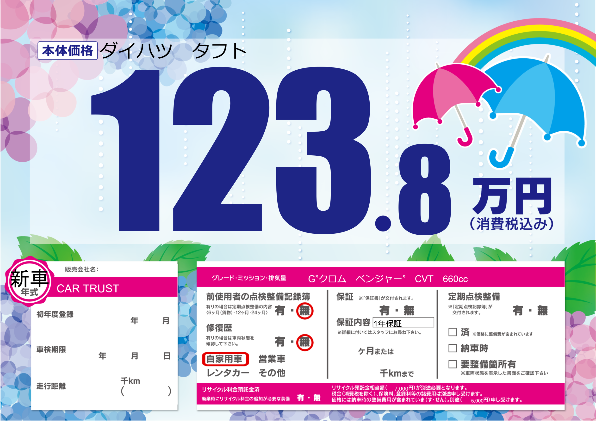 | 車名 | ダイハツ タフト | グレード ミッション 排気量 |