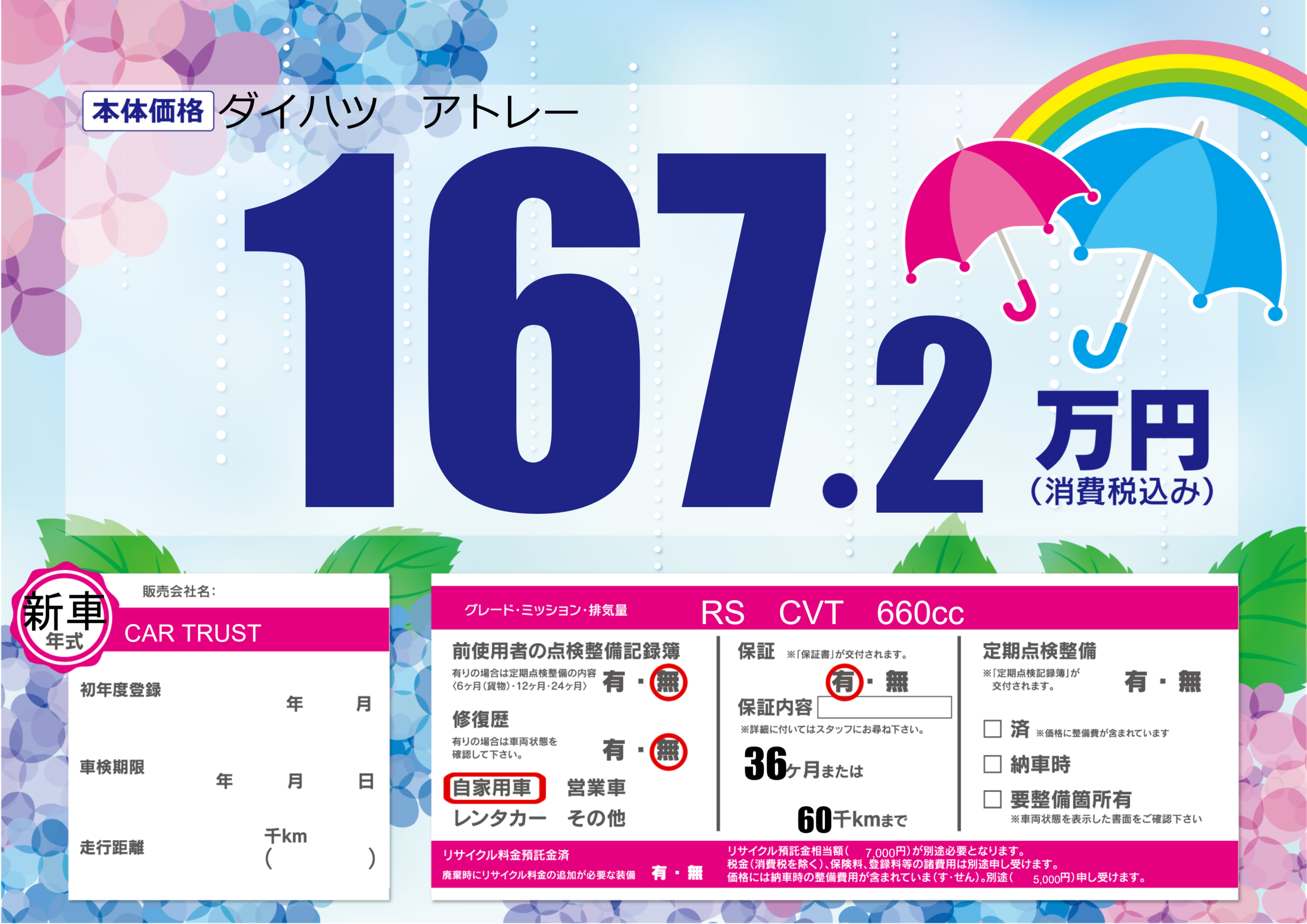 | 車名 | ダイハツ アトレー | グレード ミッション 排気量 |