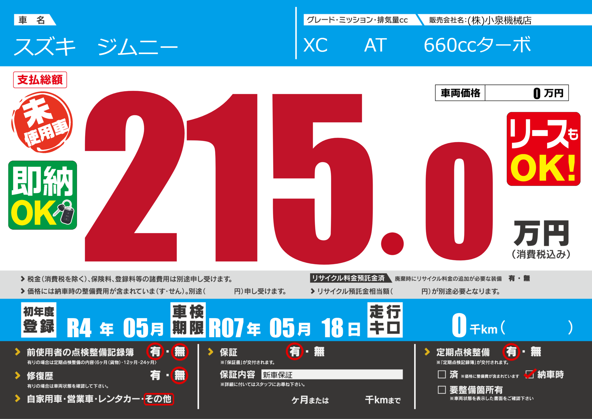| 車名 | スズキ ジムニー | グレード ミッション 排気量 |