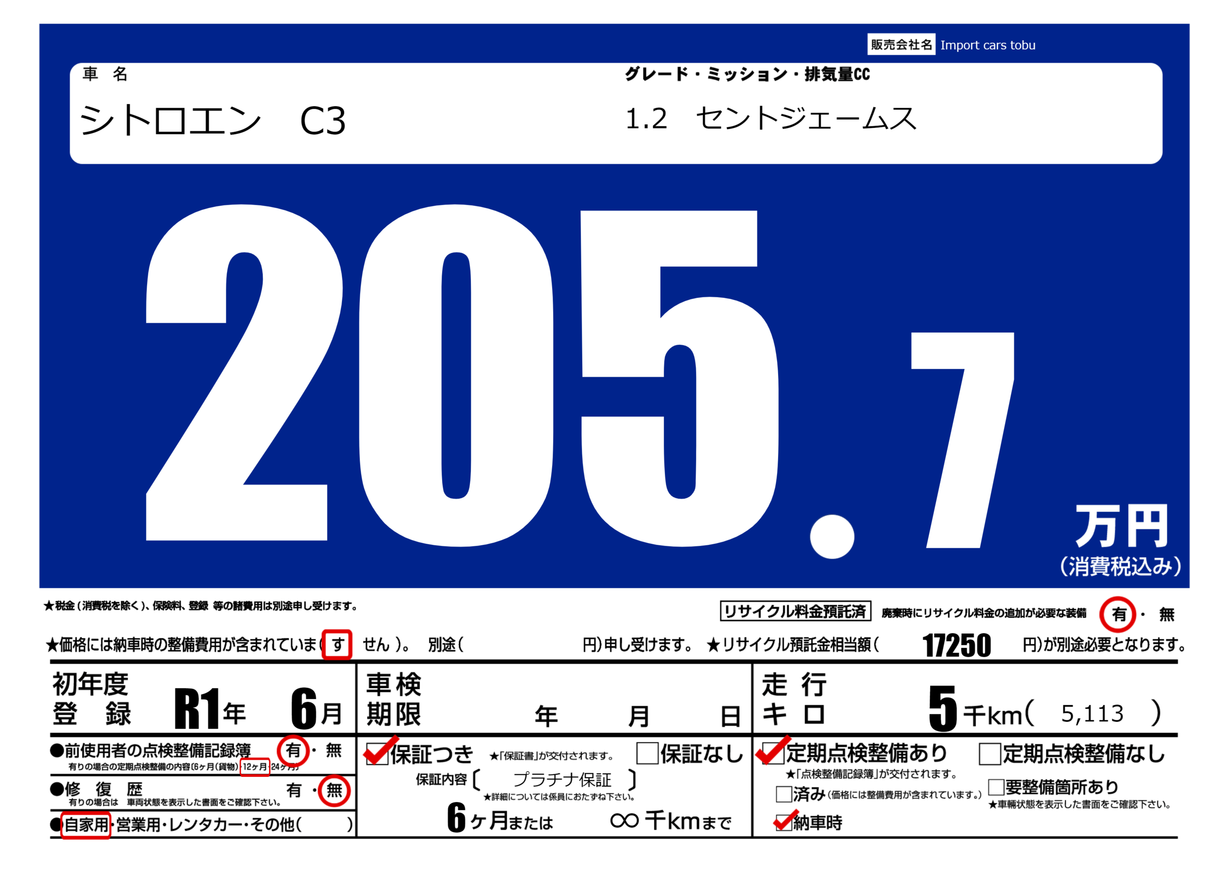 | 車名 | シトロエン C3 | グレード ミッション 排気量 |