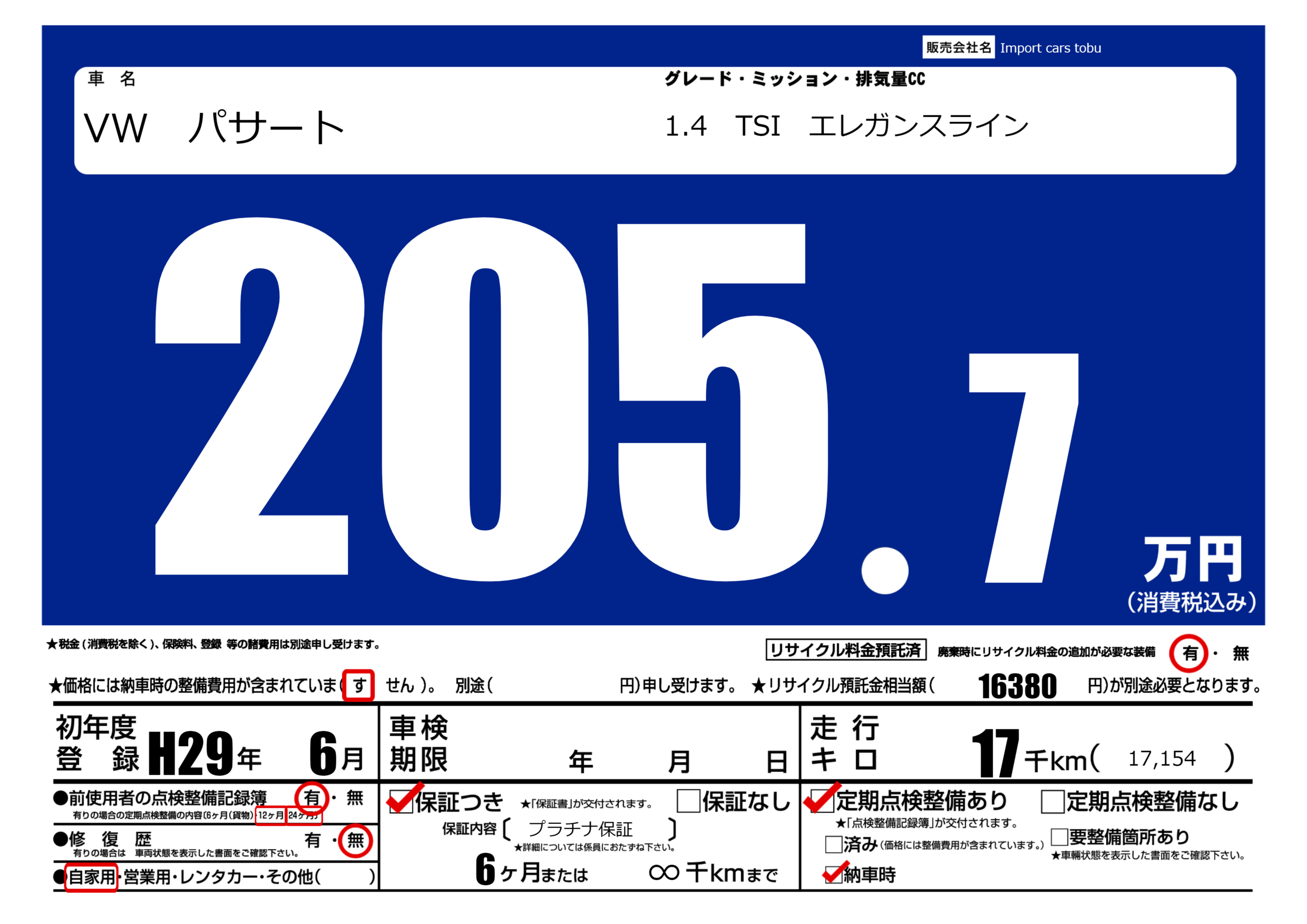 | 車名 | VW パサート | グレード ミッション 排気量 |