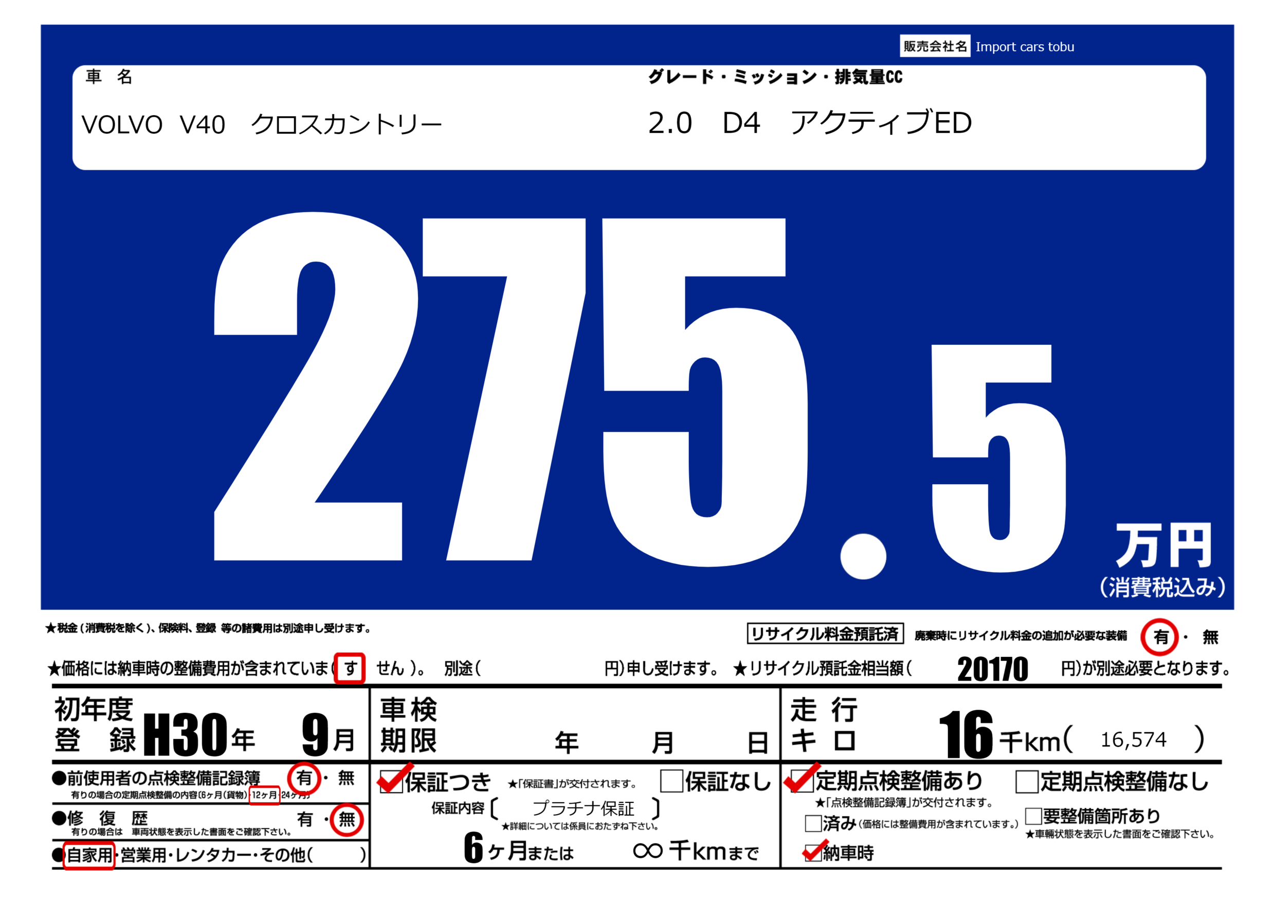 保証付き 保証内容( プラチナ保証) 6ヶ月または(∞)千kmまで |