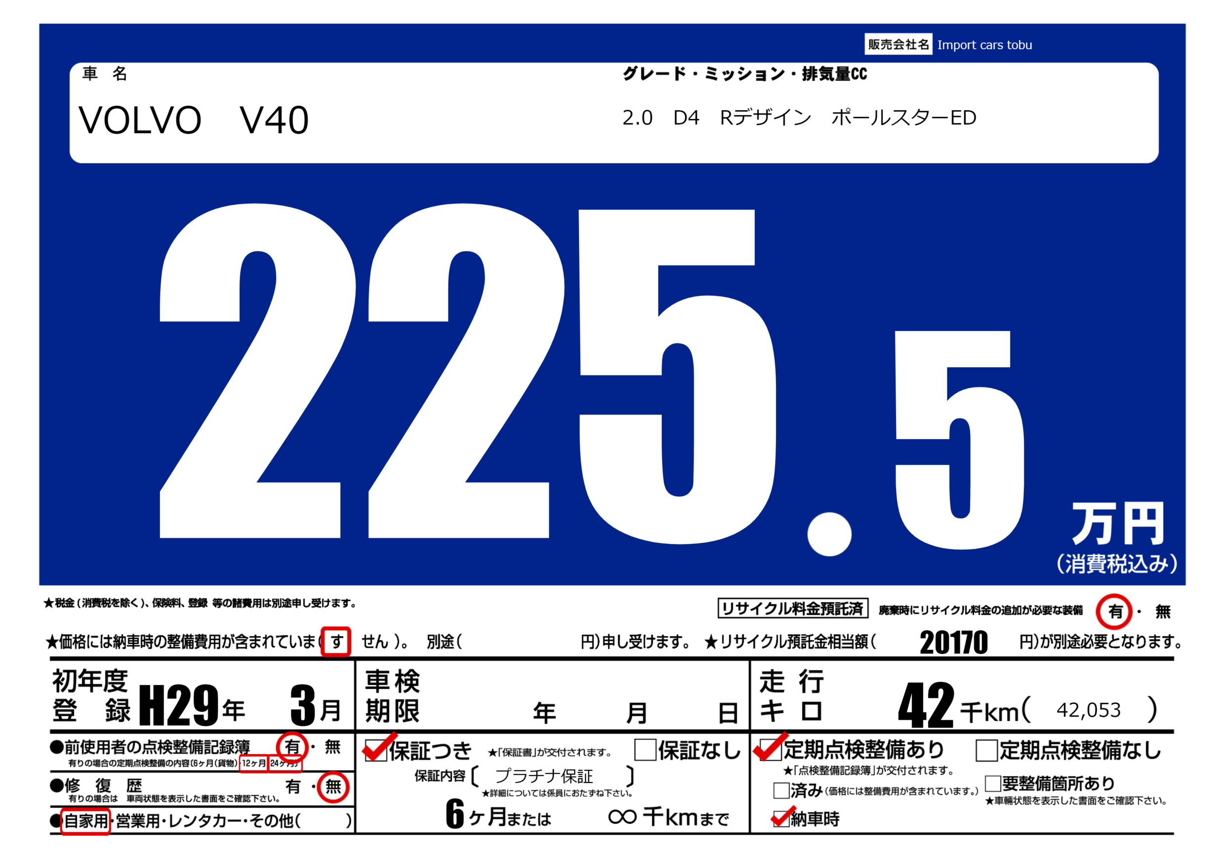 | 車名 | VOLVO V40 | グレード ミッション 排気量 |