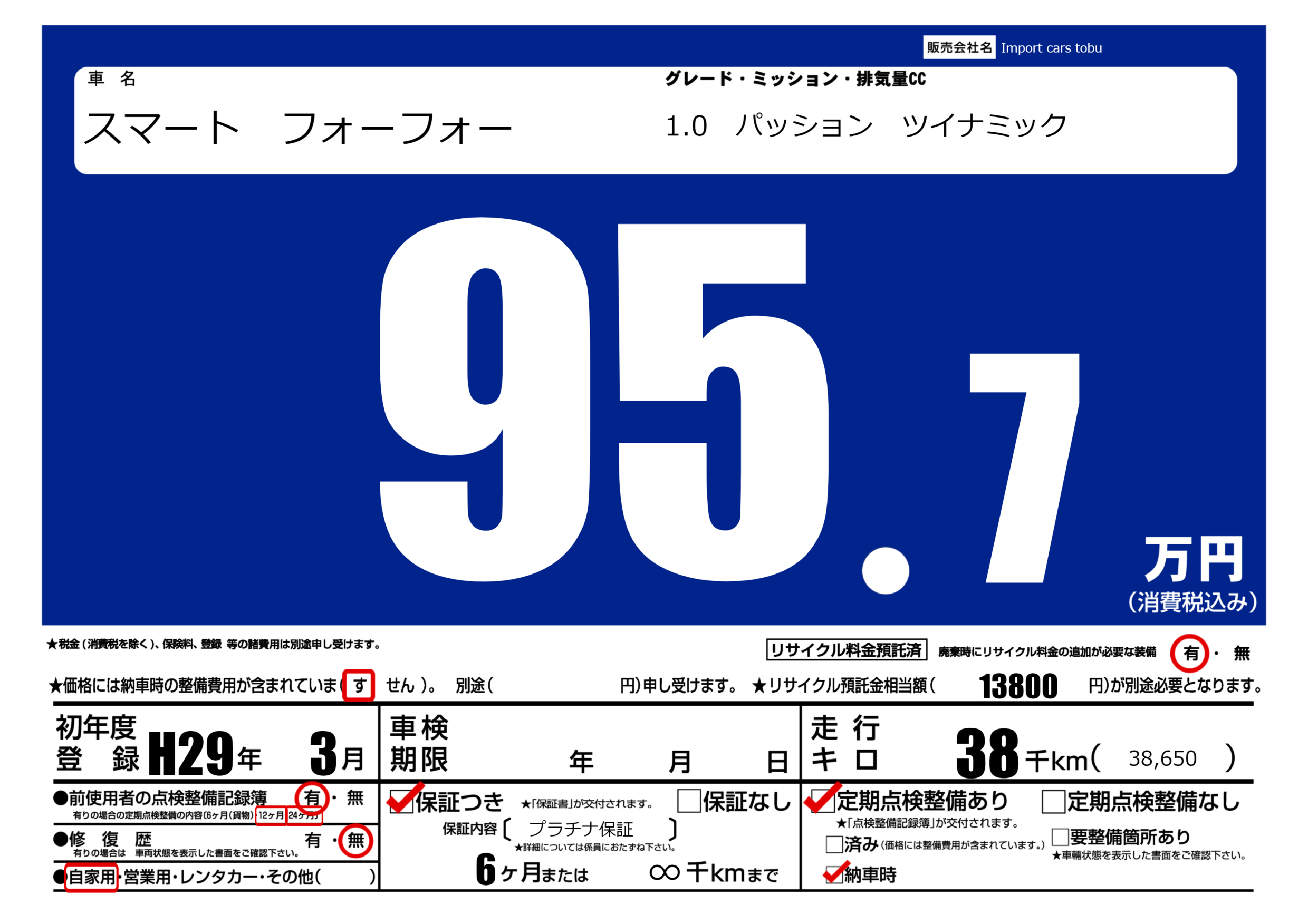 保証付き 保証内容( プラチナ保証) 6ヶ月または(∞)千kmまで |