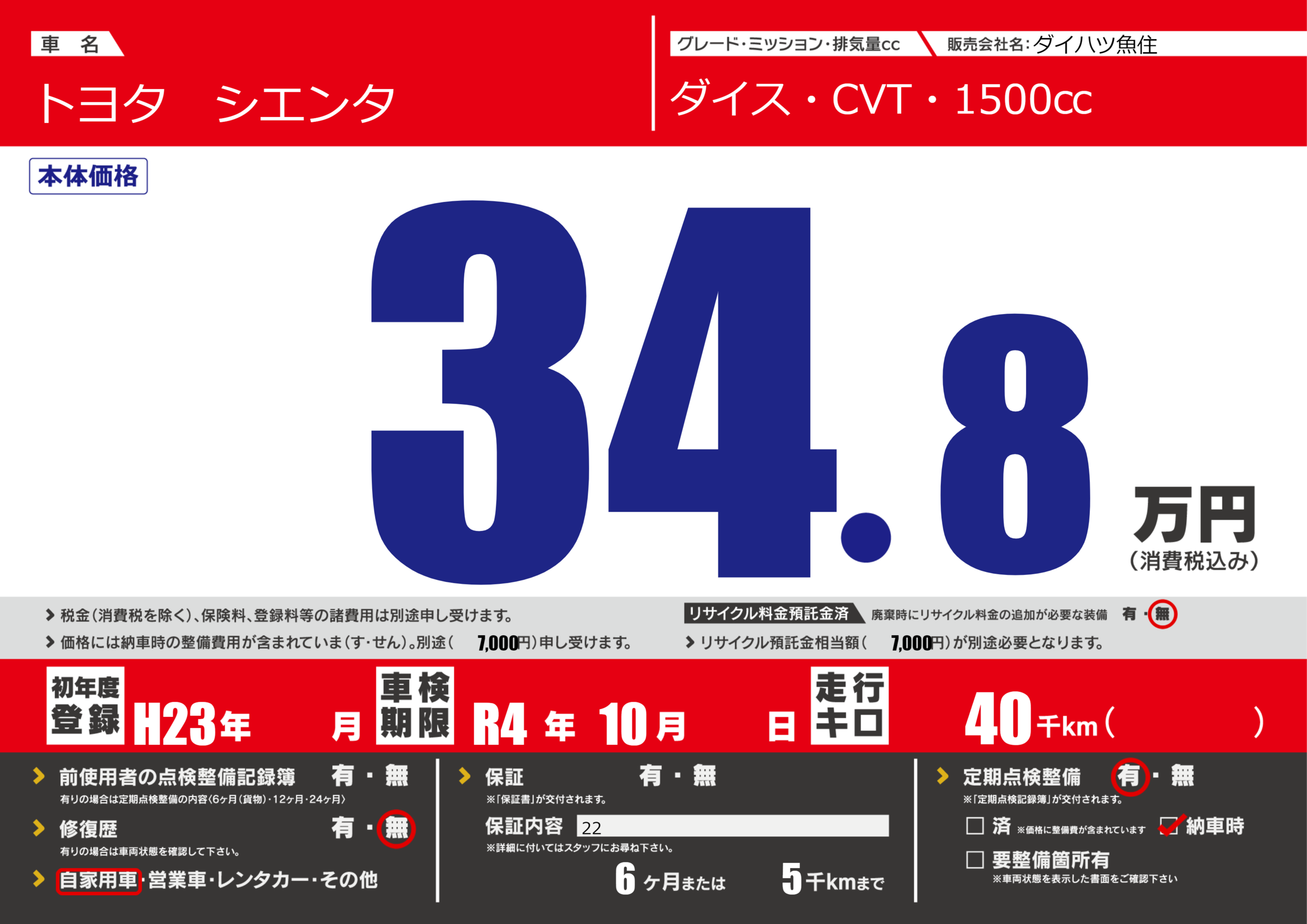 保証なし 保証内容(22) 6ヶ月または(5)千kmまで |