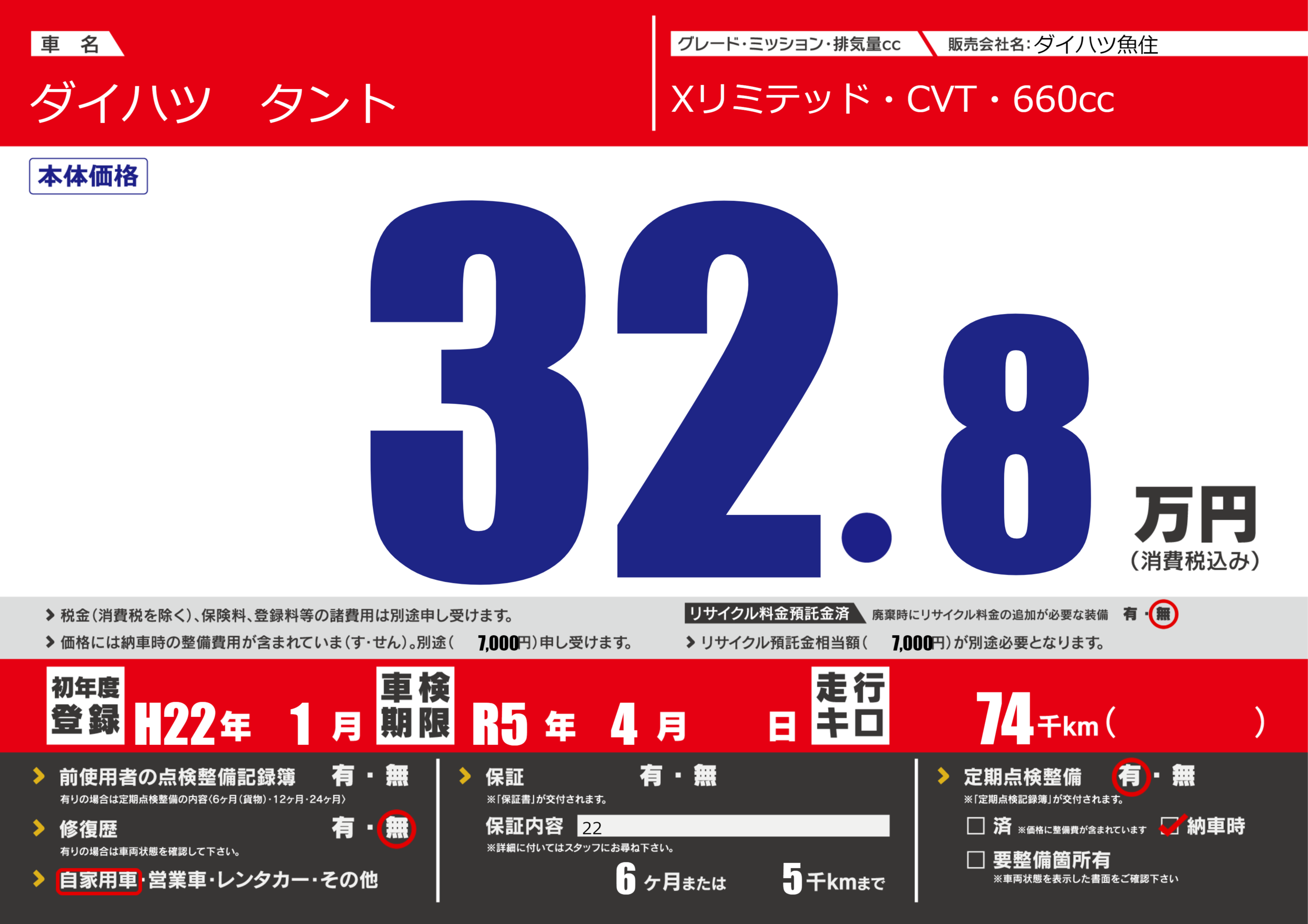保証なし 保証内容(22) 6ヶ月または(5)千kmまで |