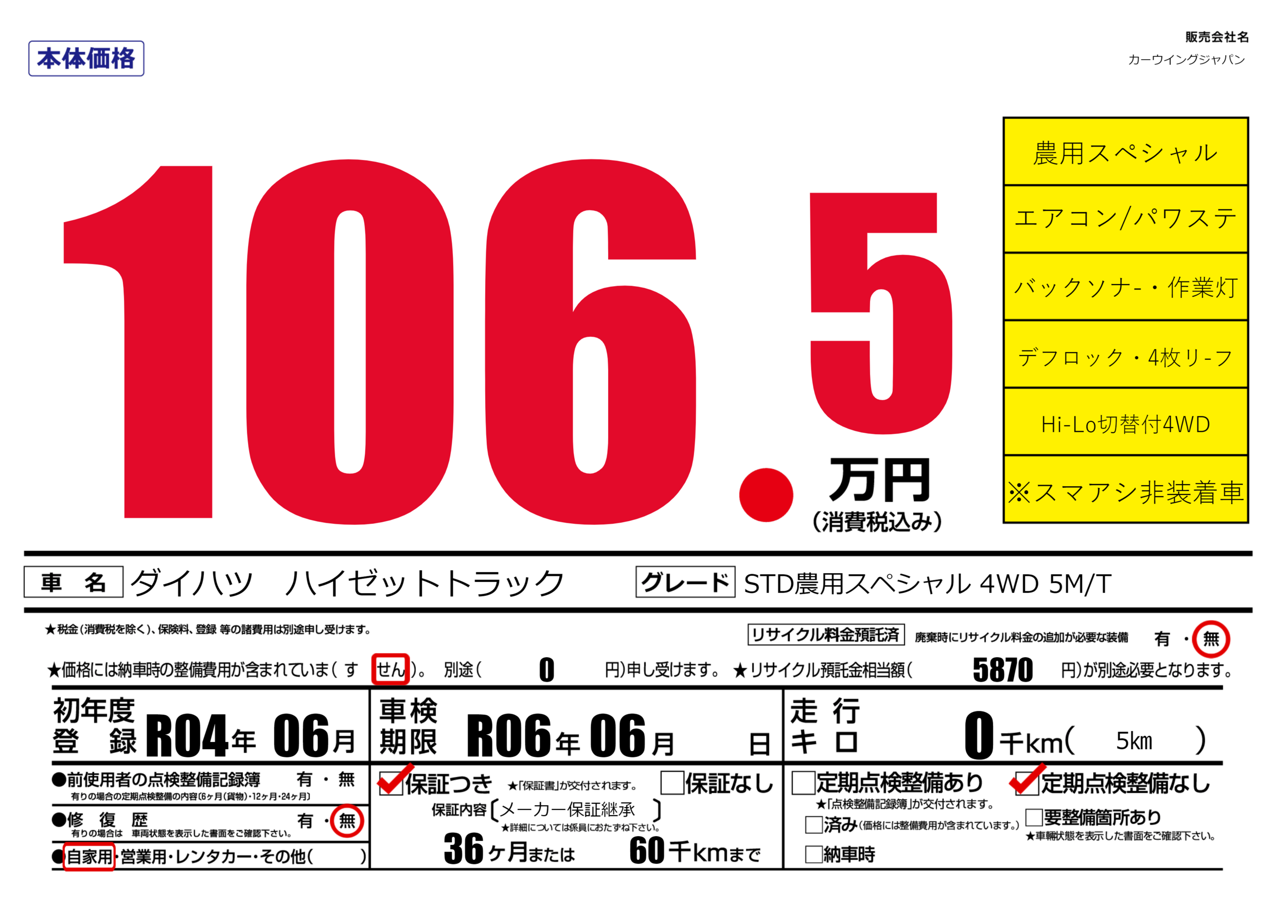 | 走行キロ | - | 初年度登録 | R04年06月 |