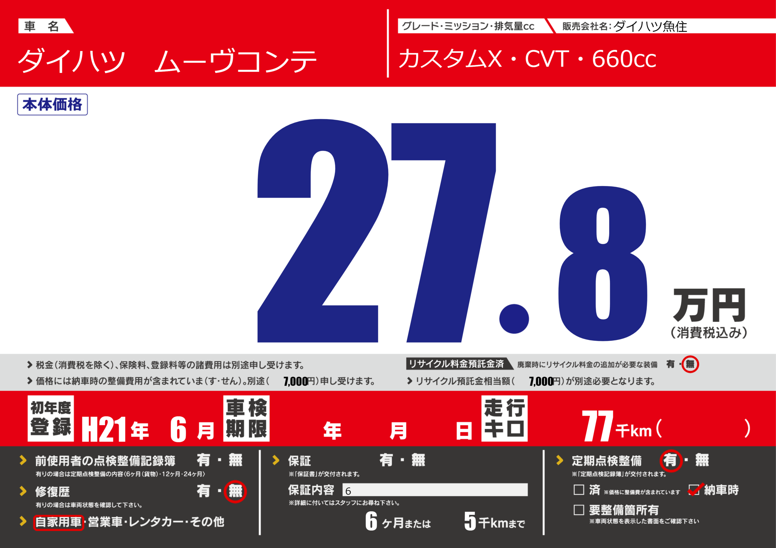 | 走行キロ | 7.7万km | 初年度登録 | H21年6月 |