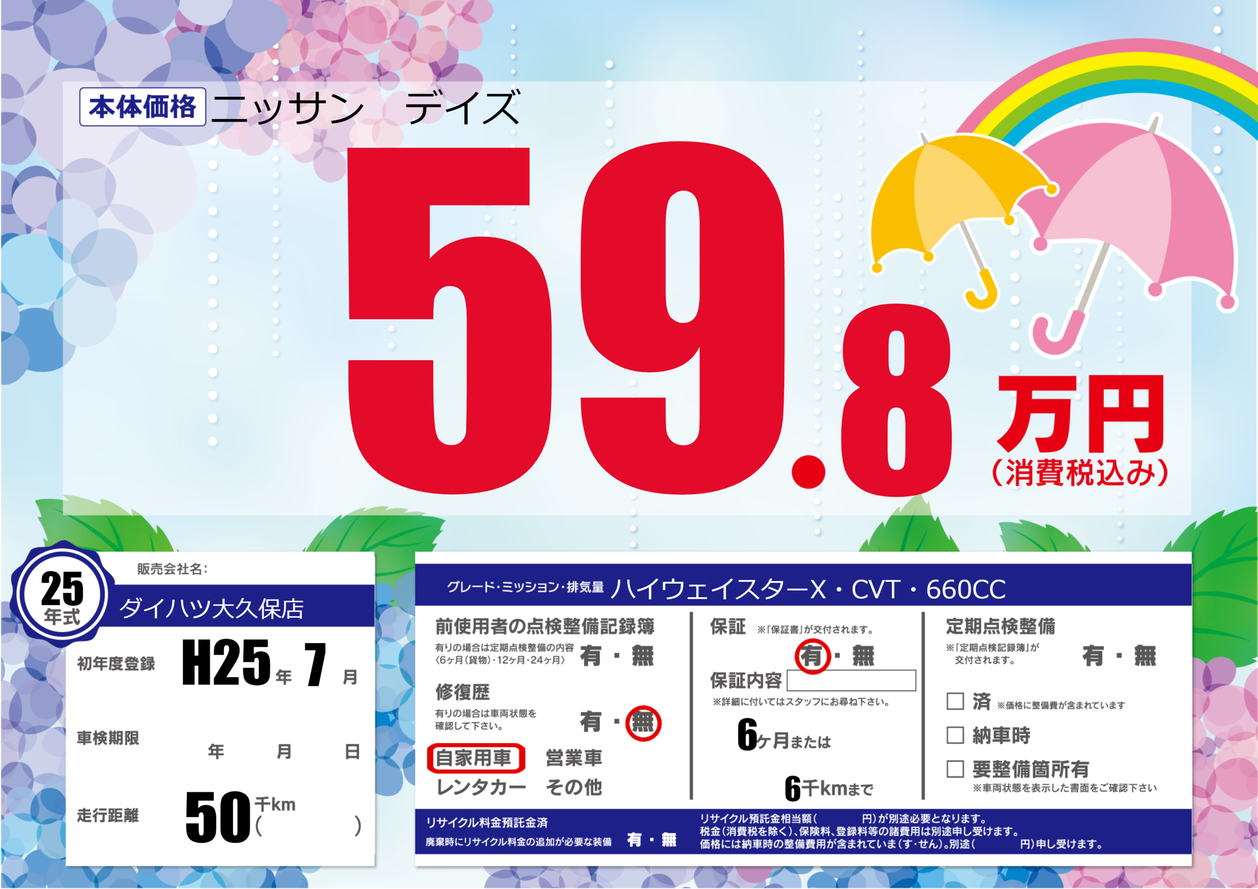 | 車名 | ニッサン デイズ | グレード ミッション 排気量 |