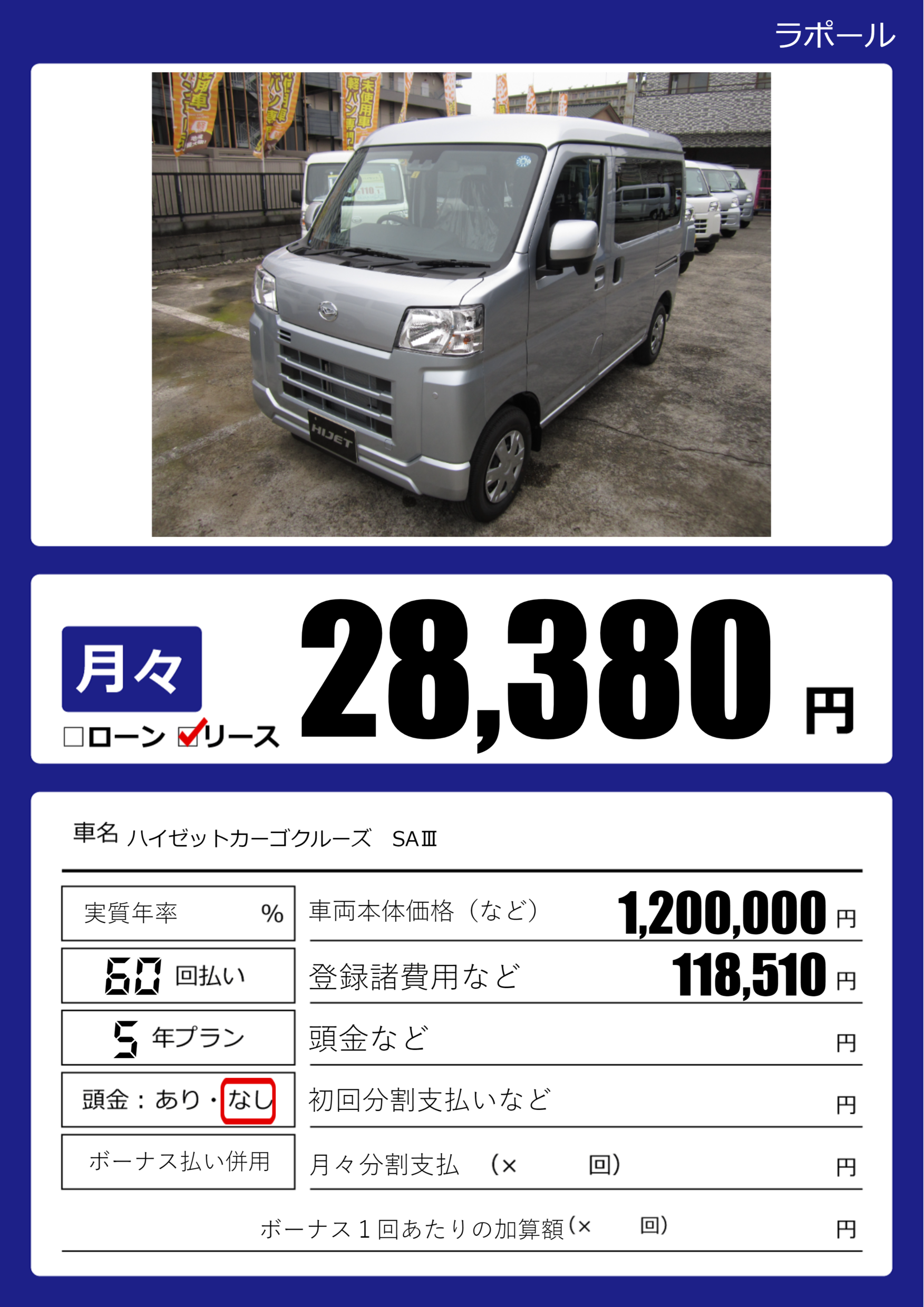 | 車名 | ハイゼットカーゴクルーズ SAⅢ | グレード ミッション 排気量 |