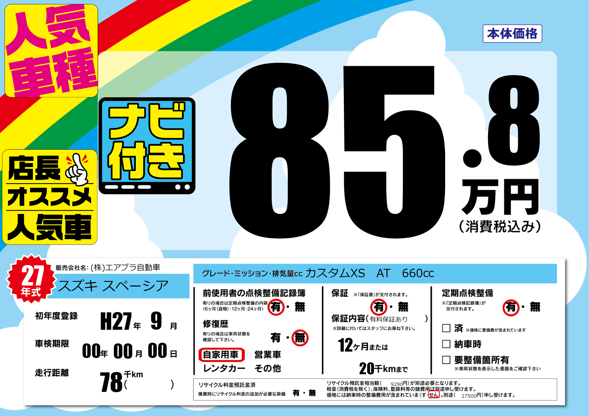 | 走行キロ | 7.8万km | 初年度登録 | H27年9月 |