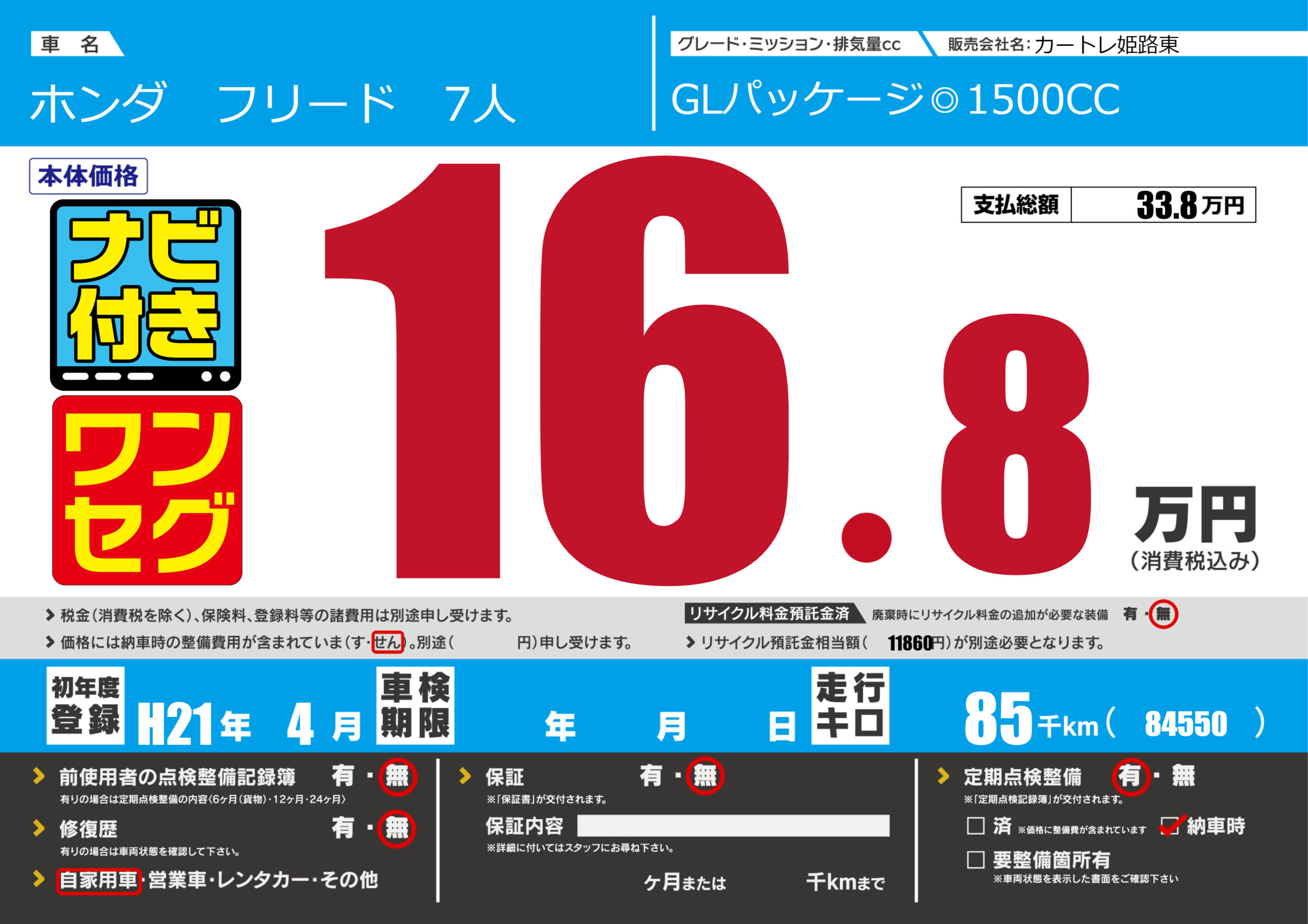| 車名 | ホンダ フリード 7人 | グレード ミッション 排気量 |