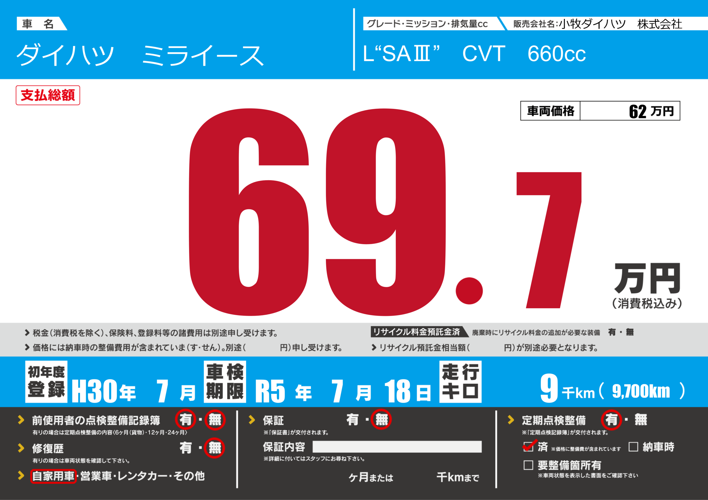 | 定期点検整備 | 定期点検整備あり 定期点検整備済み | ||