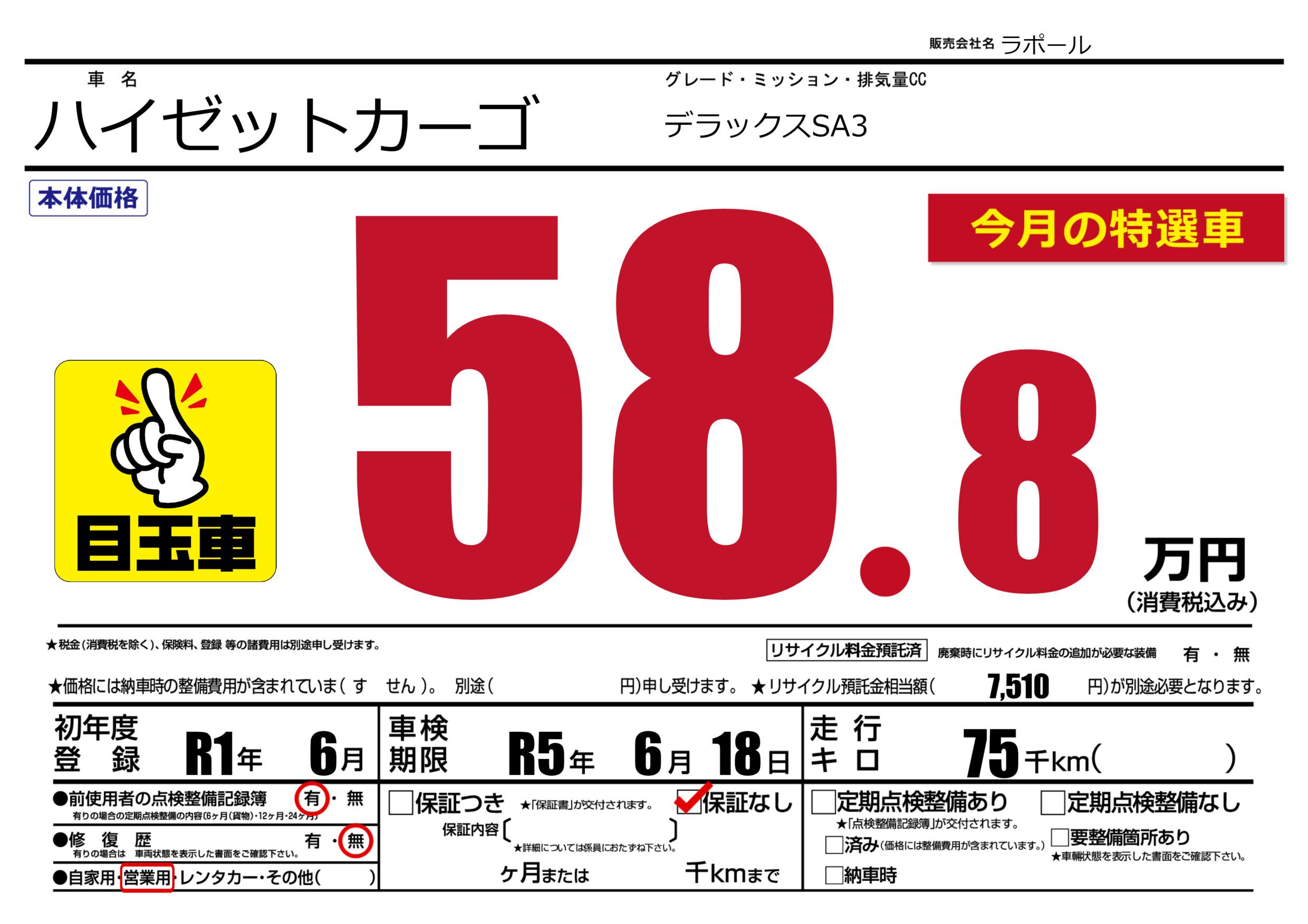 | 車名 | ハイゼットカーゴ | グレード ミッション 排気量 |