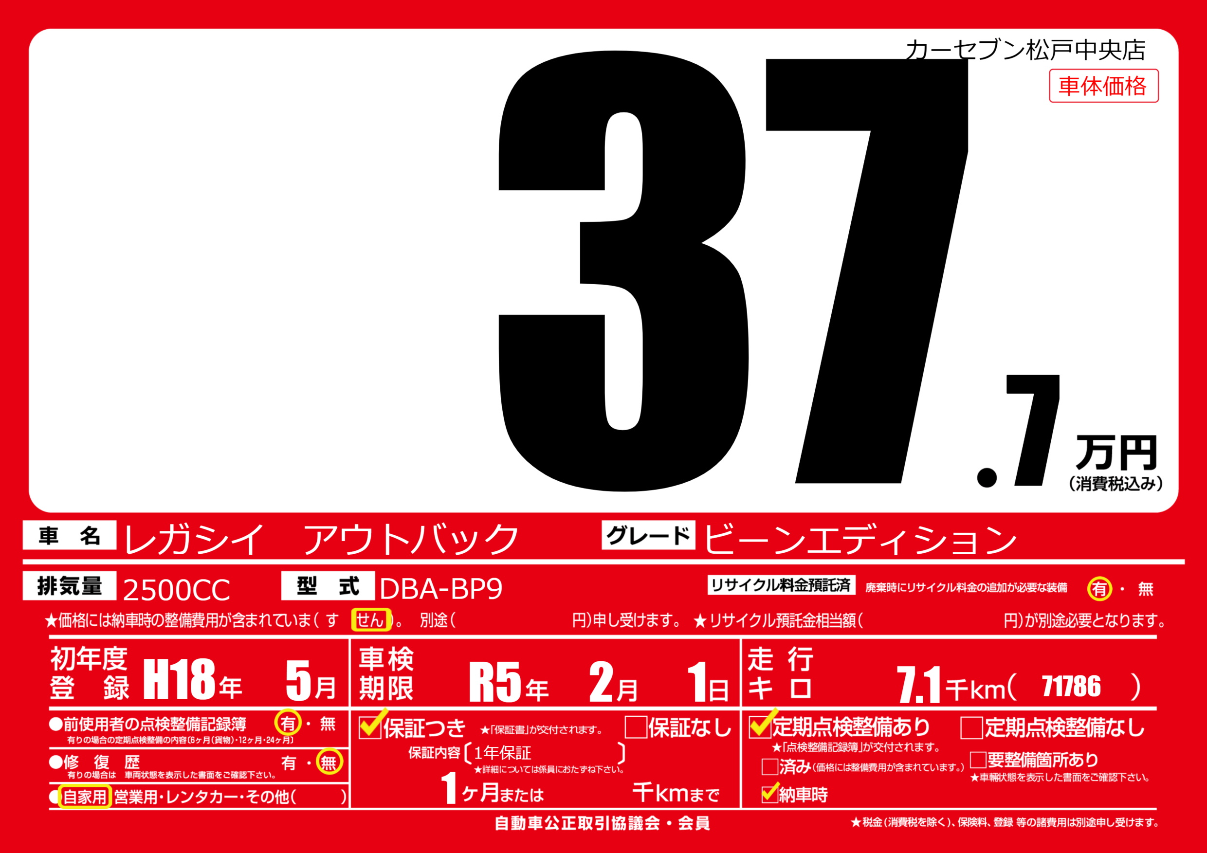 | 車名 | レガシイ アウトバック | グレード ミッション 排気量 |