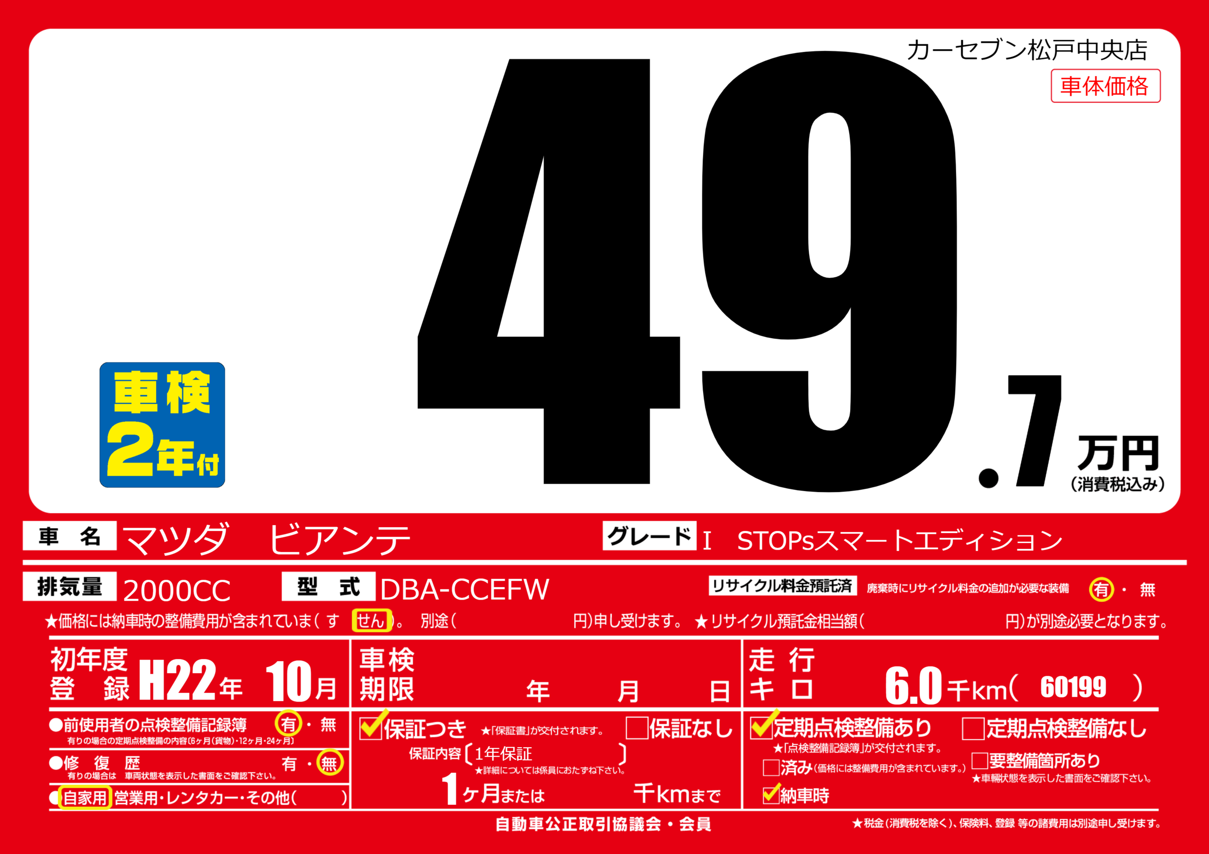 | 車名 | マツダ ビアンテ | グレード ミッション 排気量 |