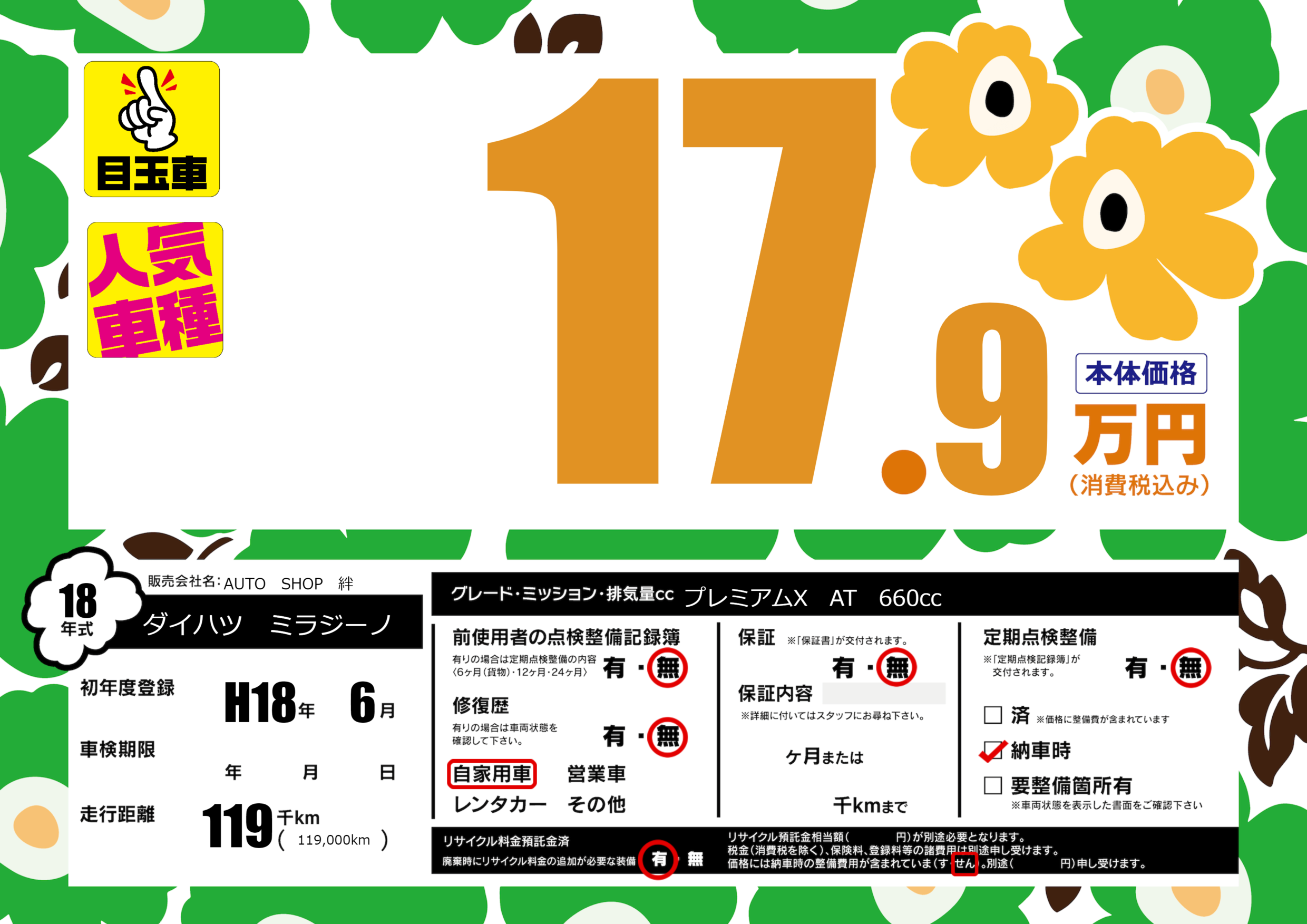 | 走行キロ | 11.9万km | 初年度登録 | H18年6月 |