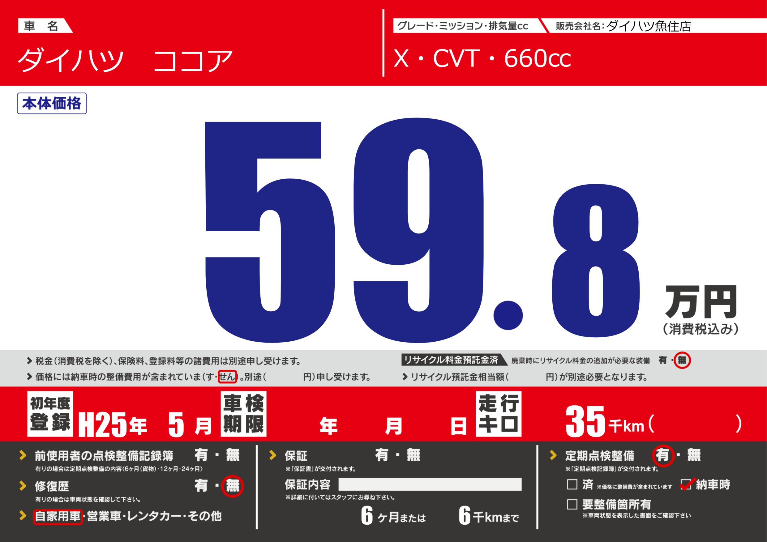 | 車名 | ダイハツ ココア | グレード ミッション 排気量 |